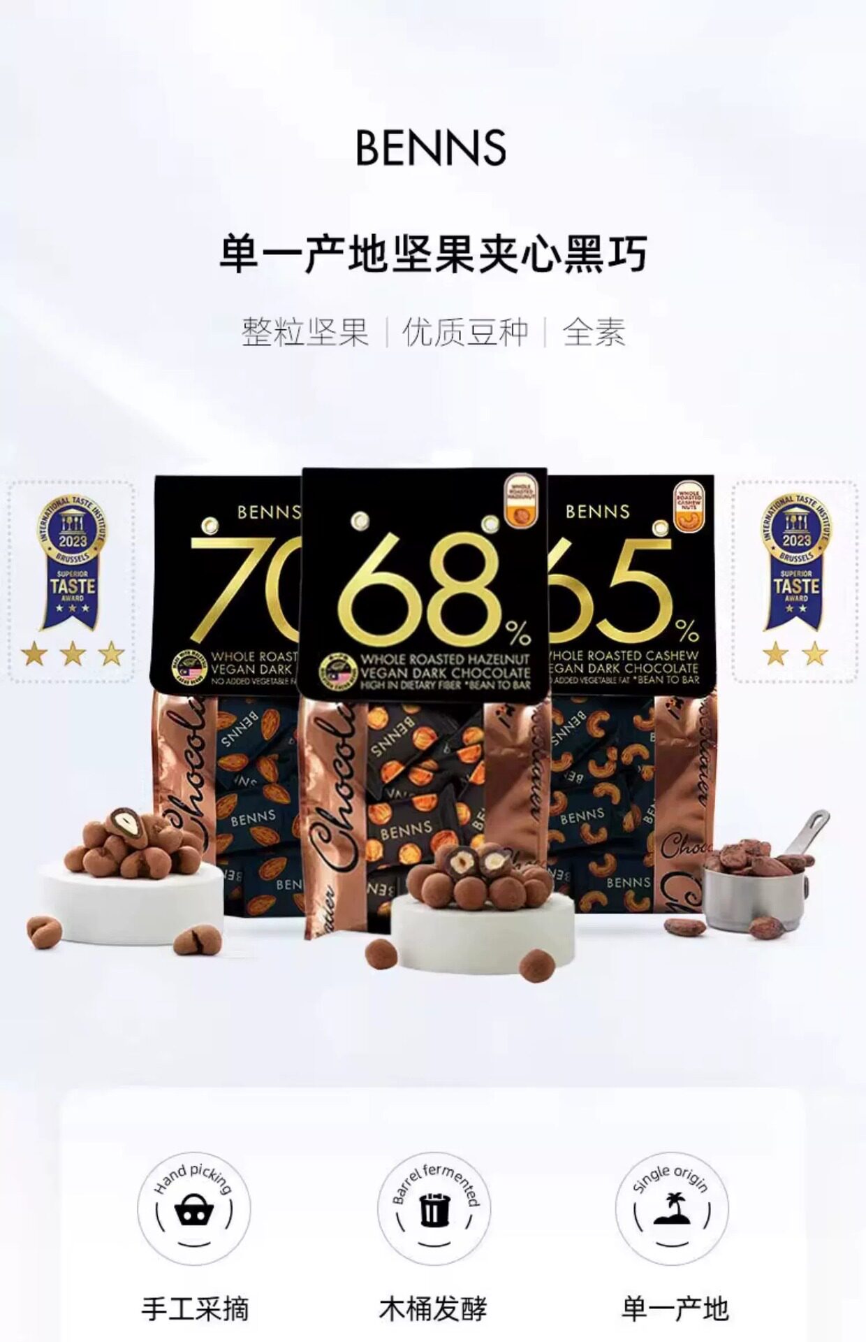 Beness 68% Dark Chocolate Beness Nut Cocoa Butter Whole Nuts Almond Hazelnut 138g