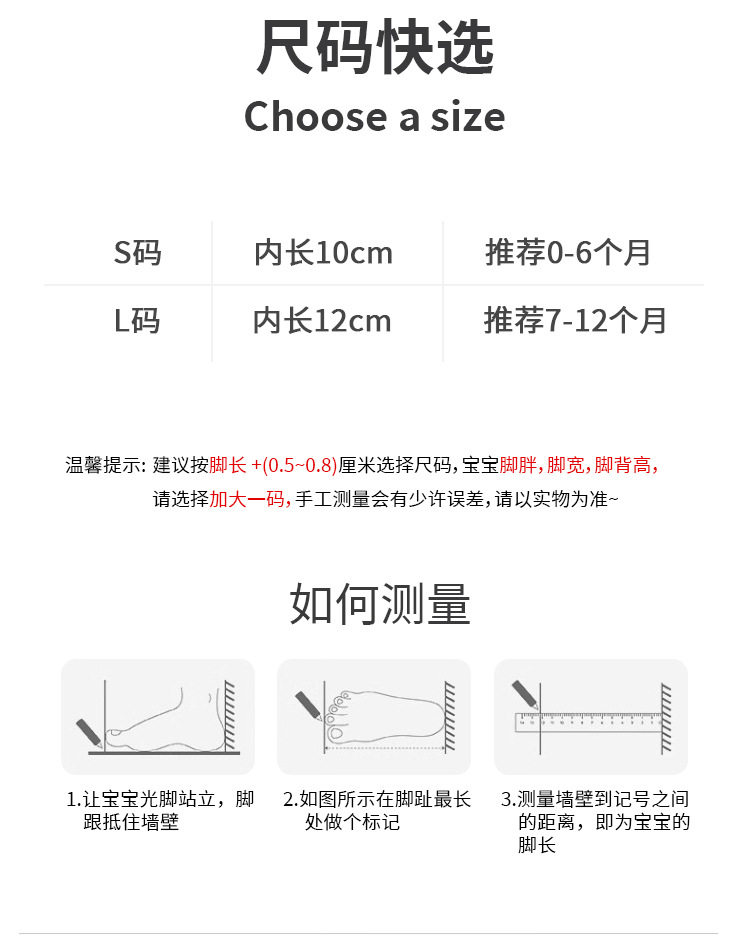 | Size | Inner length 10cm s size - recommended for 0-6 months,Inner length 12cm l size - recommended for 6-12 months |