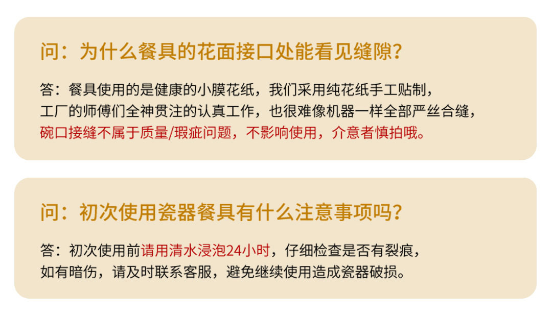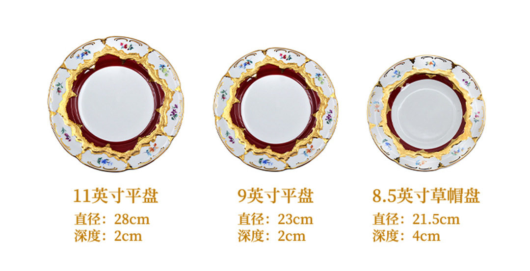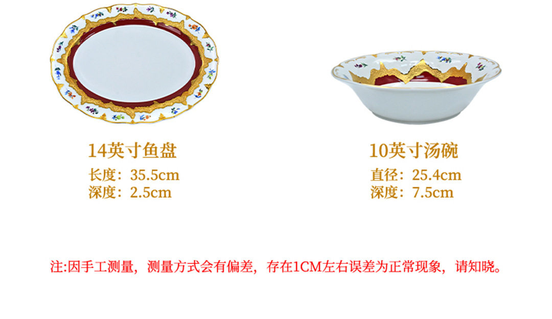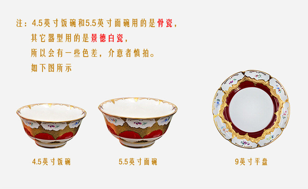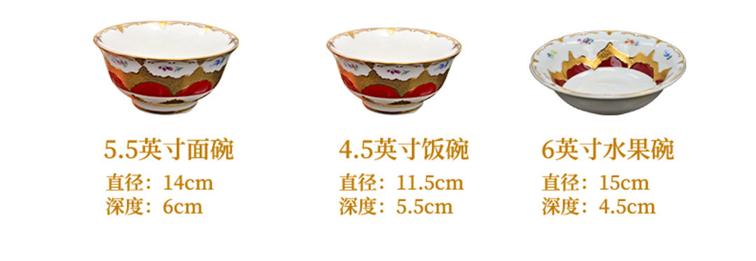 | Color | 4.5inch rice bowl [wanhua golden red] 1 head,5.5inch noodle bowl [wanhua golden red] 1 head,6inch fruit bowl [wanhua golden red] 1 head,8.5inch straw hat plate [wanhuajinhong] 1 head,11inch flat plate [wanhua golden red] 1 head,14inch fish plate [wanhua golden red] 1 head,Affordable family package for 4 people [wanhua golden red] 9 heads,21-head hospitality outfit for 6 people [wanhua golden red],Luxury outfit for 8 people and 40 heads [wanhua golden red],12.5inch fish plate [wanhua gold and red] |