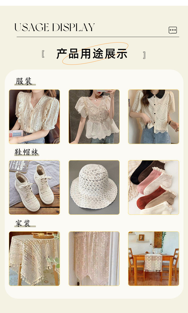 | Scope of application | Pajamas,Underwear,Women's clothing,Headwear,Ethnicity,Underpants,Dress,Home,Shirt,Decorate,Scarf,Stockings,Shoes and hats,Belt,Bedding,Curtain,Crafts,Wedding dress,Stockings,Dress,Clothing,Children's clothing,Accessories,Accessories,Home textiles,Seamless panties,Sofa cushion,Diy handmade,Fishnet stockings,Blanket,Clothing,Body corset,Skirt,Mom outfit,Lace underwear,Home textile products,Packaging ribbon,Window decorations,Bow lace,Home intimates,Home soft furnishings,Toy accessories,Corset tummy control pants,Silicone lace stockings,Blanket tassel,Towel shower cap,Four-piece set of accessories,Sleepwear, apparel, lingerie, wedding dresses, decorations, children's clothing, apparel, dresses, maternity clothing,Scarves, home textiles, blankets, tassels, curtains, clothing, home textiles, children's clothing, skirt, sofa cushions, bedding, clothing |