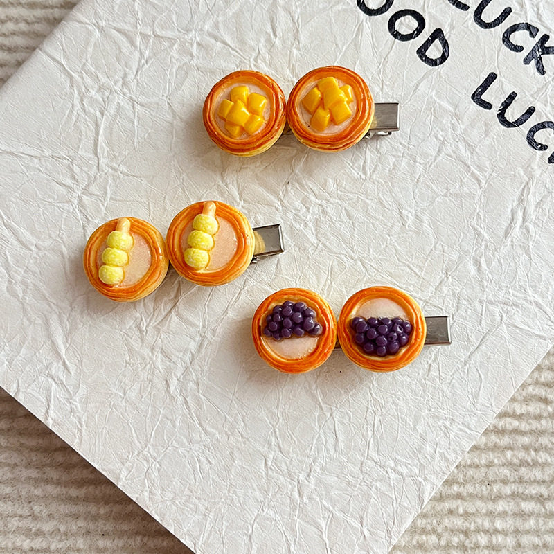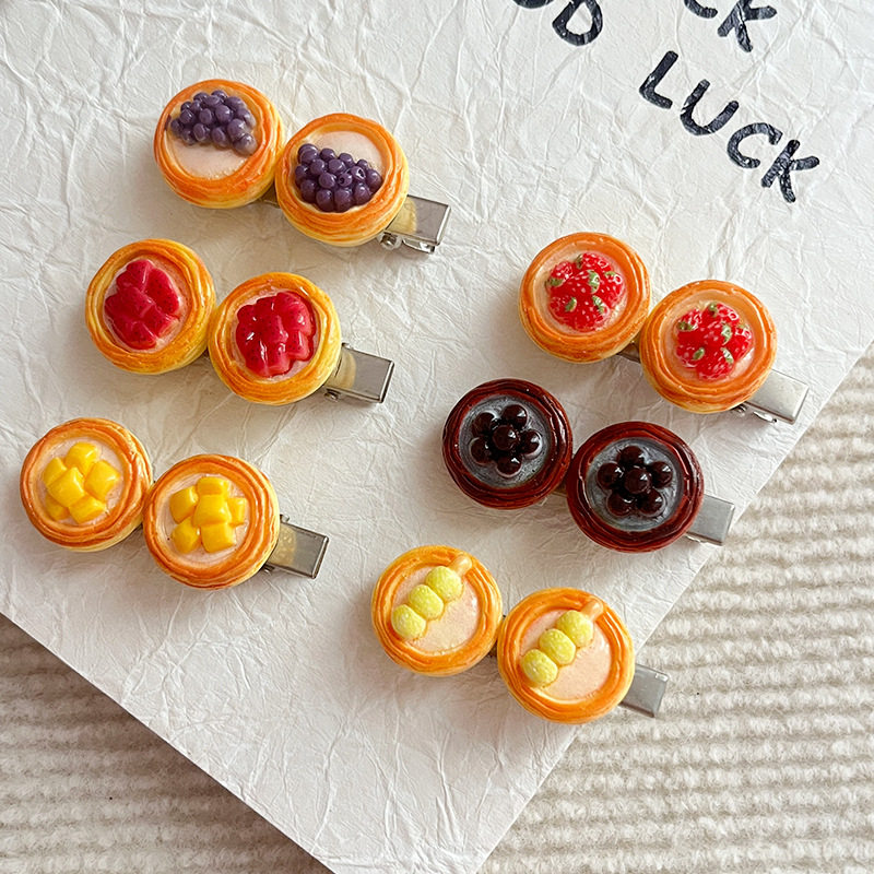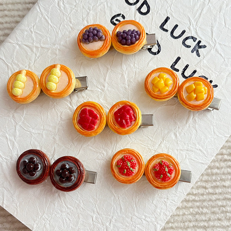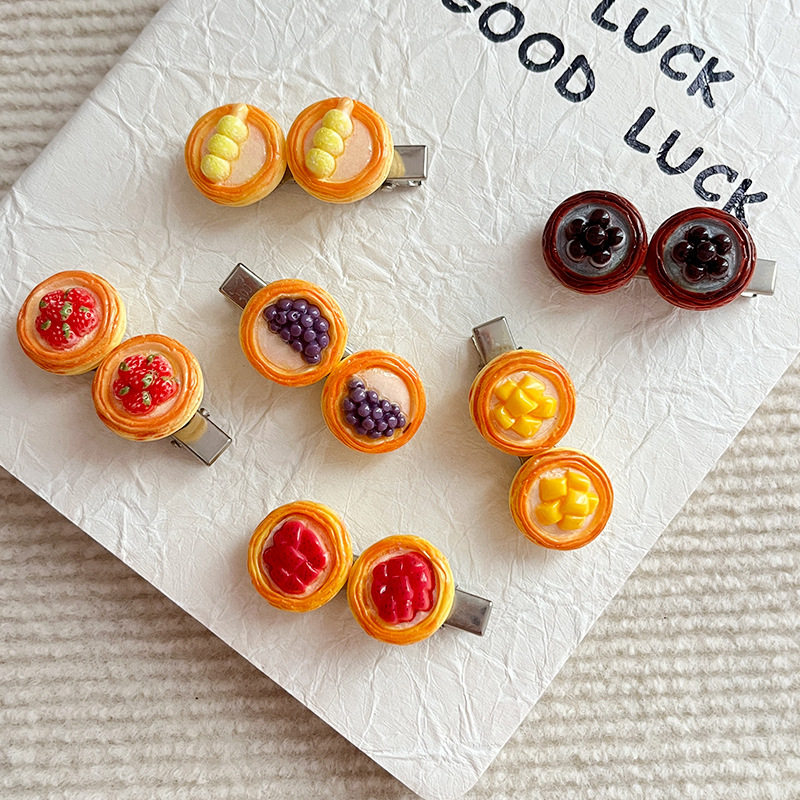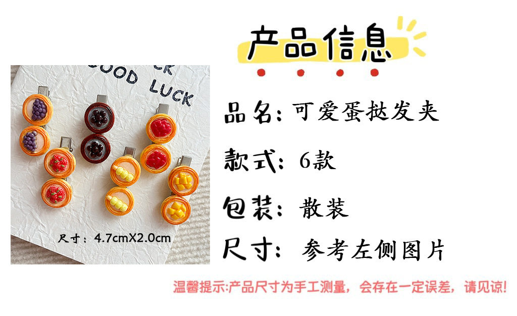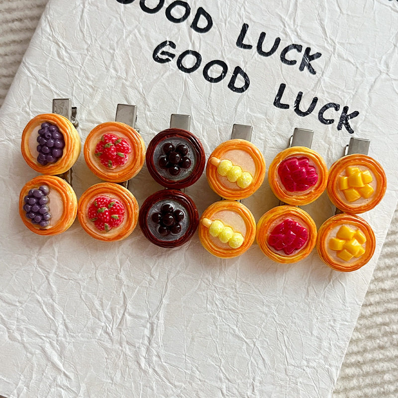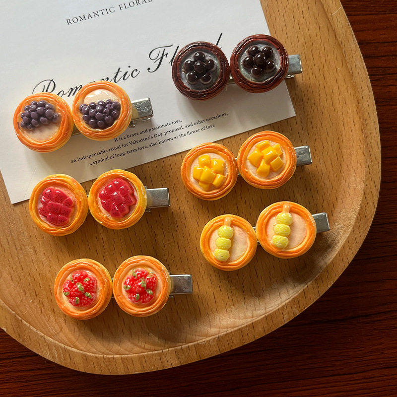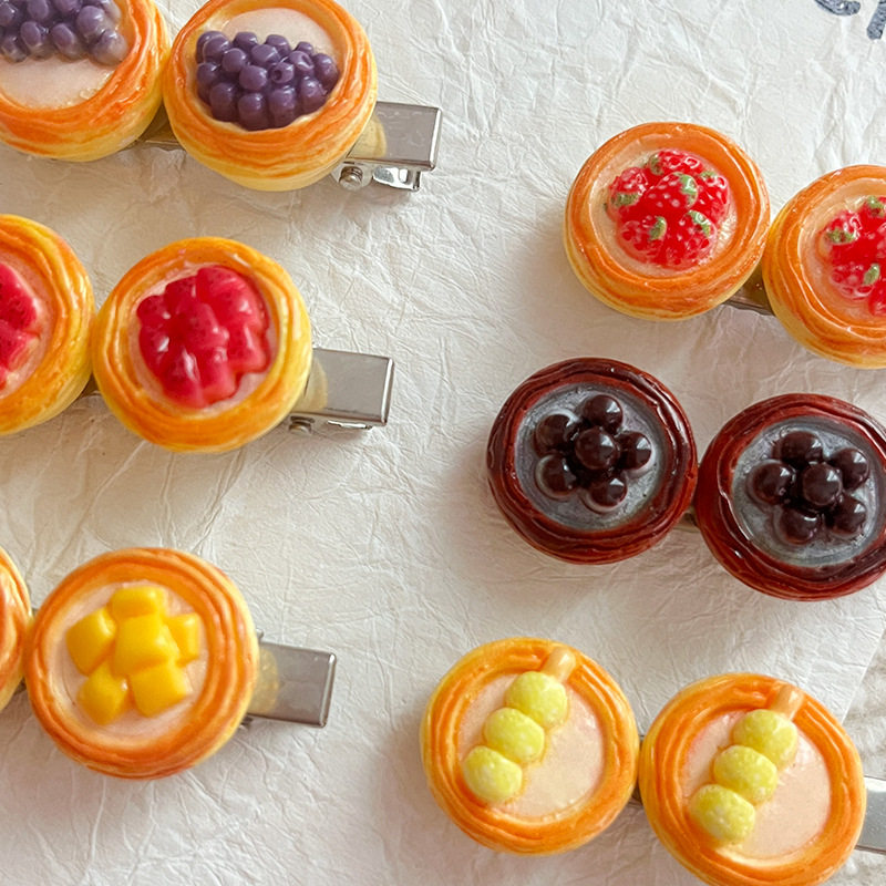 | Color | Fj-019-1 dragon fruit egg tart hairpin,Fj-019-2 strawberry tart hairpin,Fj-019-3 taro ball egg tart hairpin,Fj-019-4 pearl tart hairpin,Fj-019-5 meatball skewer egg tart hairpin,Fj-019-6 mango tart hairpin |
