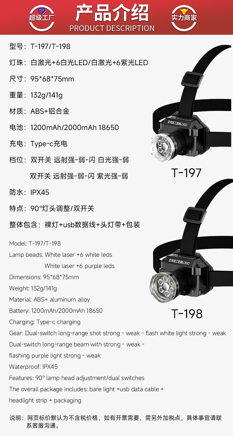 | Color | T-197 standard version (headlight + built-in battery + packaging),T-198 purple headlamp standard version (headlamp + built-in battery + packaging) |