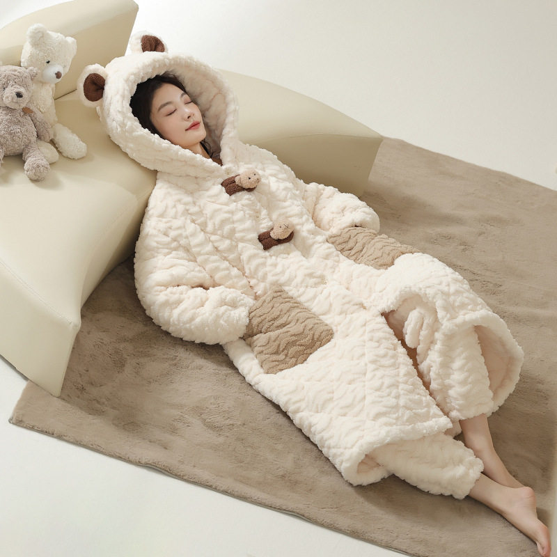 Pajamas for Women Winter Autumn and Winter Three-Layer Quilted Coral Velvet Nightgown Fleece-Lined Thickeneded Warm Home Clothes 2025 New Style