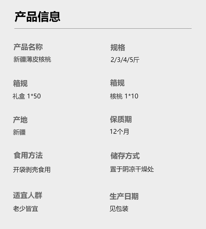 | Packaging specifications | Xinjiang thin-skinned walnuts 1.0kg pack,Xinjiang thin-skinned walnuts 1.5kg pack,Xinjiang thin-skinned walnuts 2kg pack,Xinjiang thin-skinned walnuts 2.5kg pack |