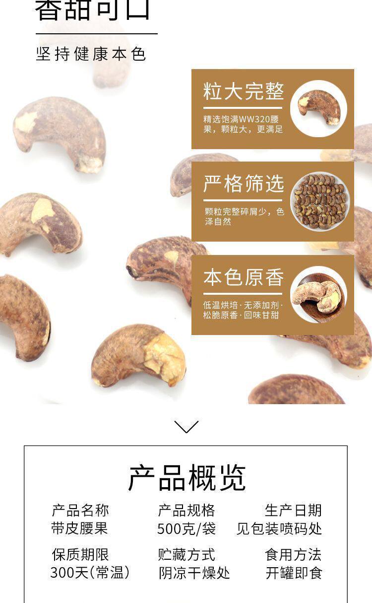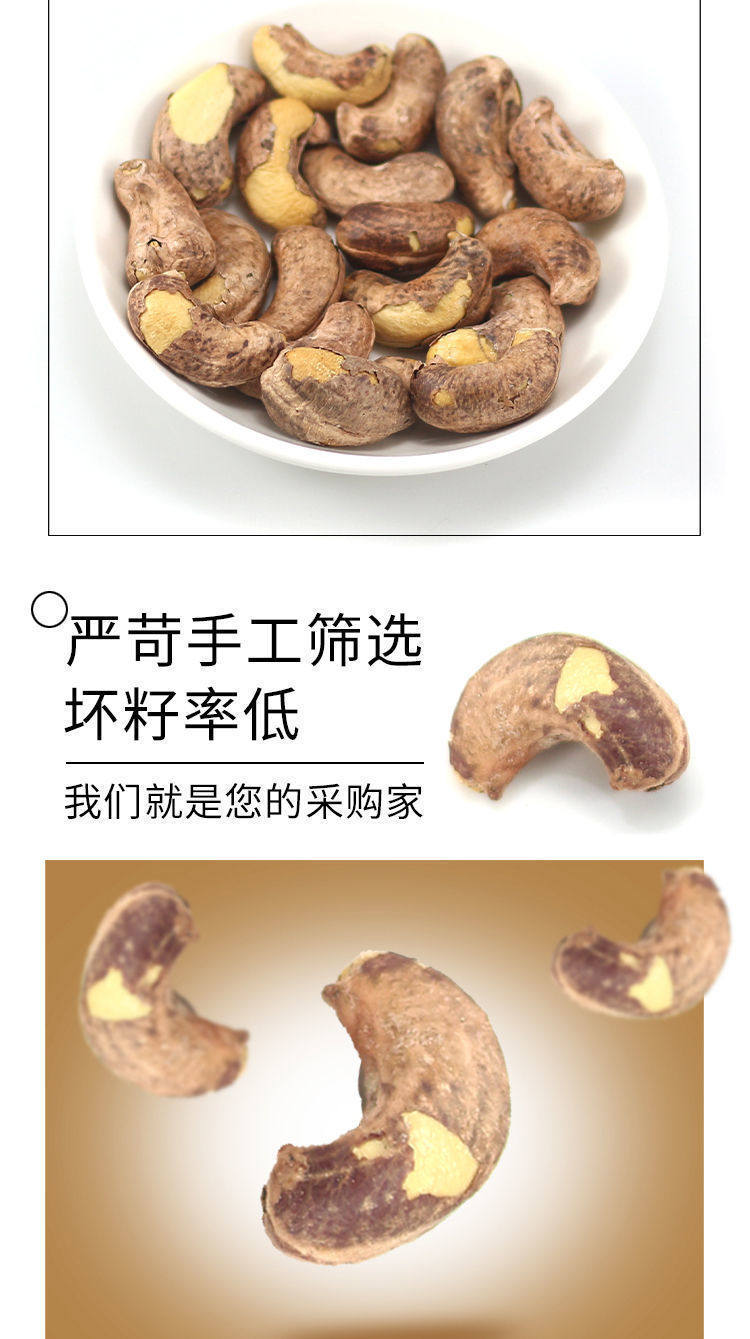 | Packaging specifications | Half a piece of tiger skin cashew nut with clothes,Extra large half piece of tiger skin cashew nuts with clothes,Medium grain tiger skin cashew nuts,Large capsules with tiger skin cashew nuts,Extra large tiger skin cashew nuts with clothes |