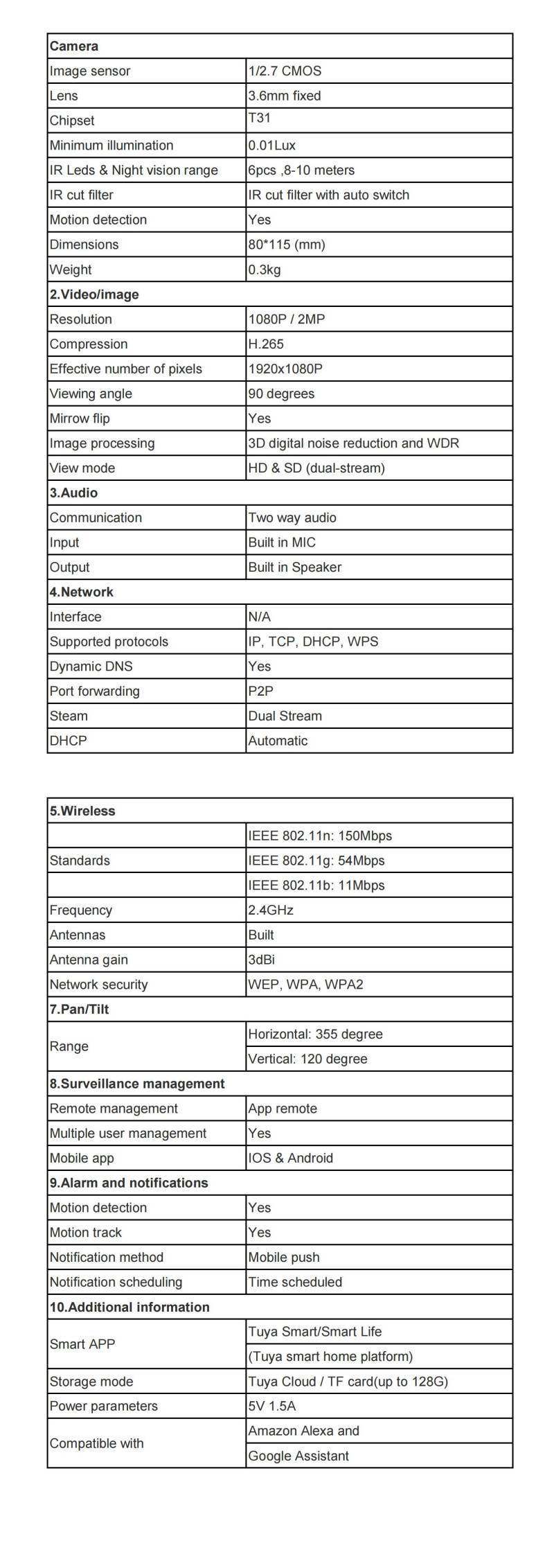 | Model | Night vision,two-way audio,human motion tracking,motion detection,pan-tilt |