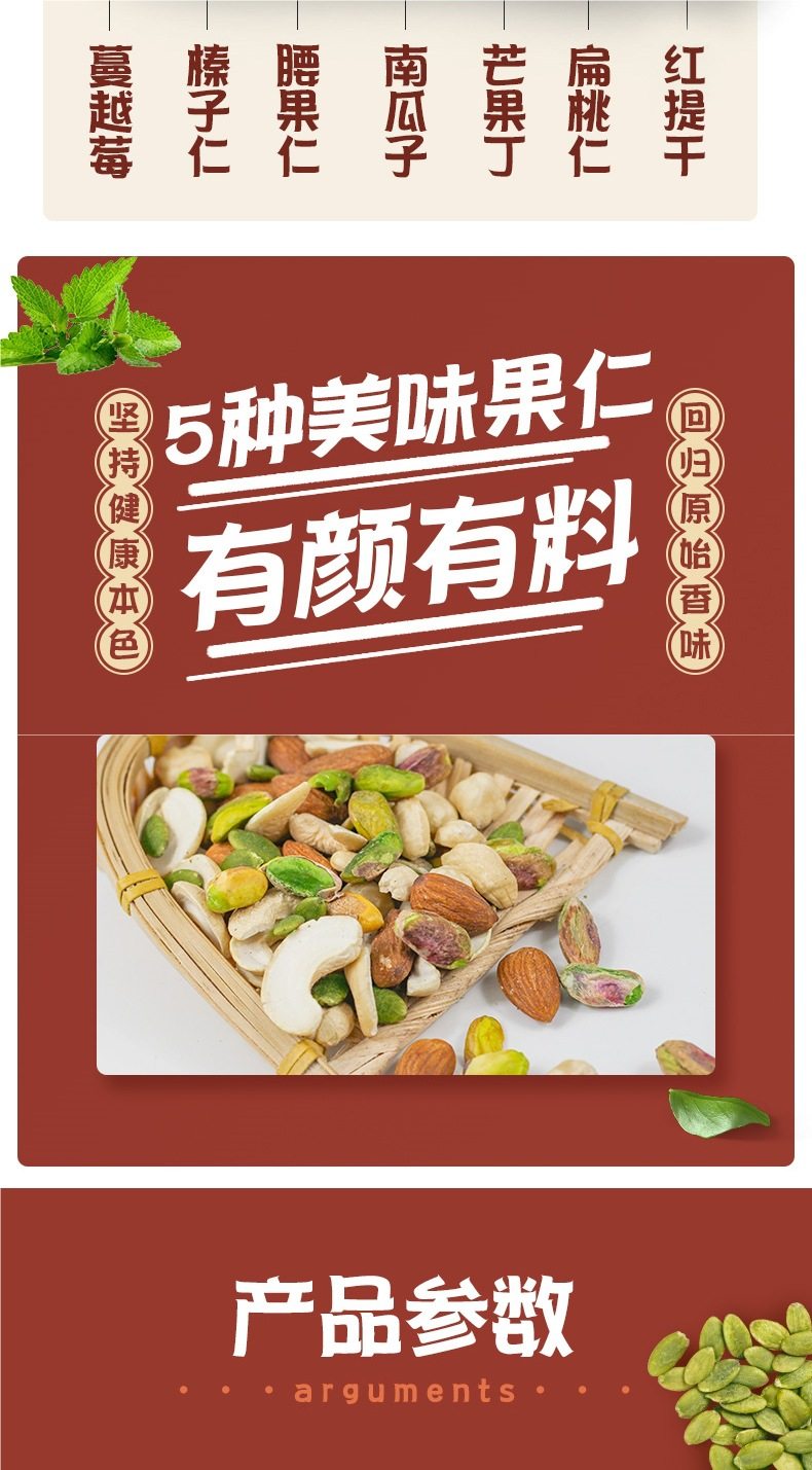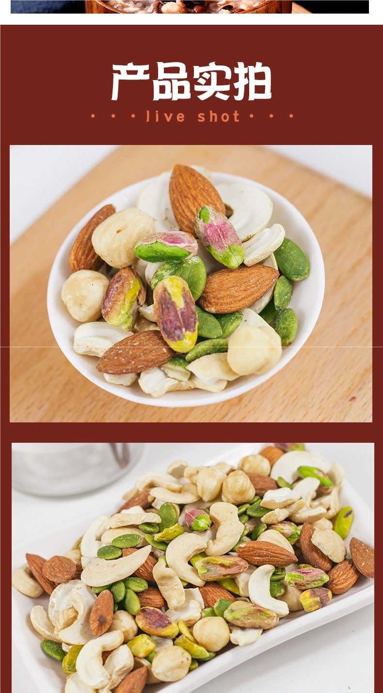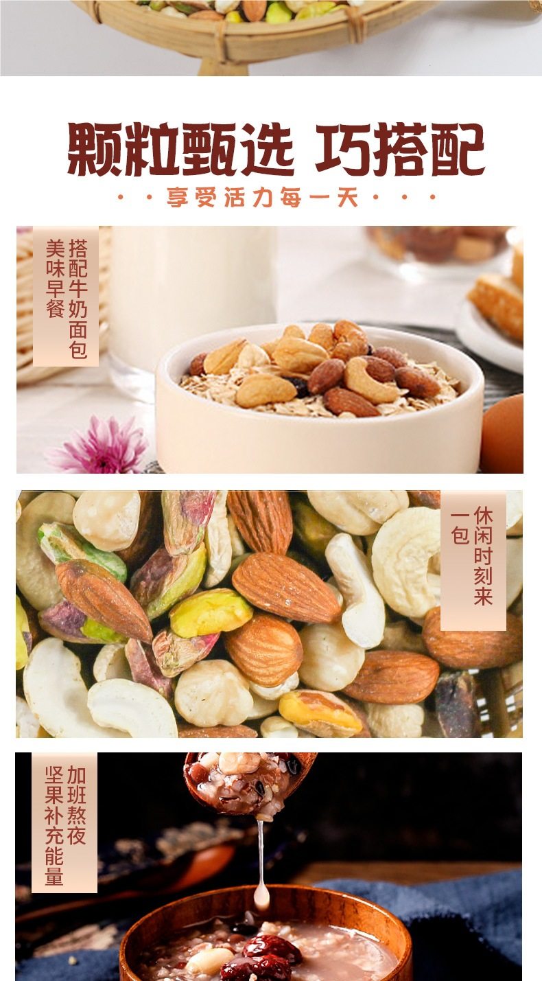 | Packaging specifications | Mixed dried fruits (nut cereal package) 250g*1 bag (dried fruit, nut and cereal ring combination),5 kinds of mixed pure nuts (including pistachios) 250g*1 bag,5 kinds of mixed pure nuts (including pistachios) 250g*2 bags,5 kinds of pure nuts (including pistachios) 2.5kg*1 bag [full box shipment],5 kinds of pure nuts (including pistachios) 2.5kg [10 aluminum foil bags included],7 kinds of mixed nuts 250g*1 bag (dried fruit and nut combination),7 kinds of mixed nuts 250g*2 bags (dried fruit and nut combination),7 kinds of mixed nuts 250g*4 bags (dried fruit and nut combination),7 kinds of mixed nuts 2.5kg*1 bag [full box shipment],7 kinds of mixed nuts 2.5kg [10 aluminum foil bags included],7 kinds of mixed nuts 12.5kg [full box batch 12.5kg],Mixed dried fruits (nut cereal package) 250g*2 bags (dried fruit and nut cereal ring combination),Mixed dried fruits (nut cereal package) 2.5kg*1 bag [full box batch 2.5kg],Mixed dried fruits (nut cereal package) 2.5kg*4 bags [full box batch 10kg] |