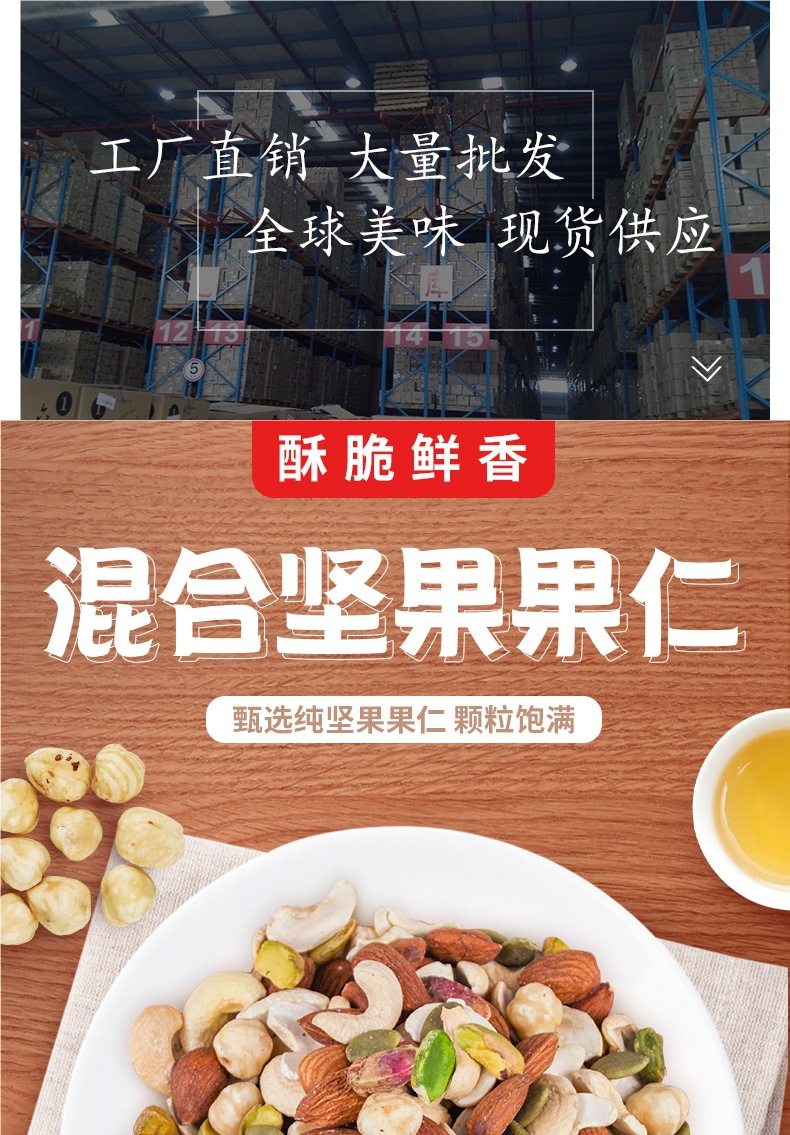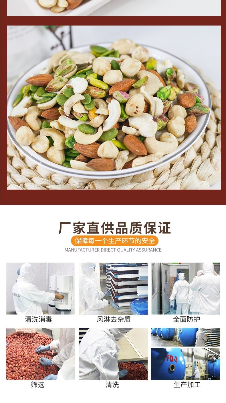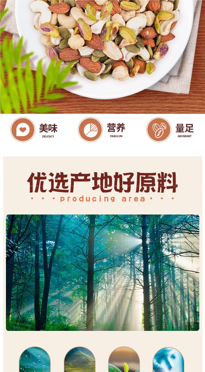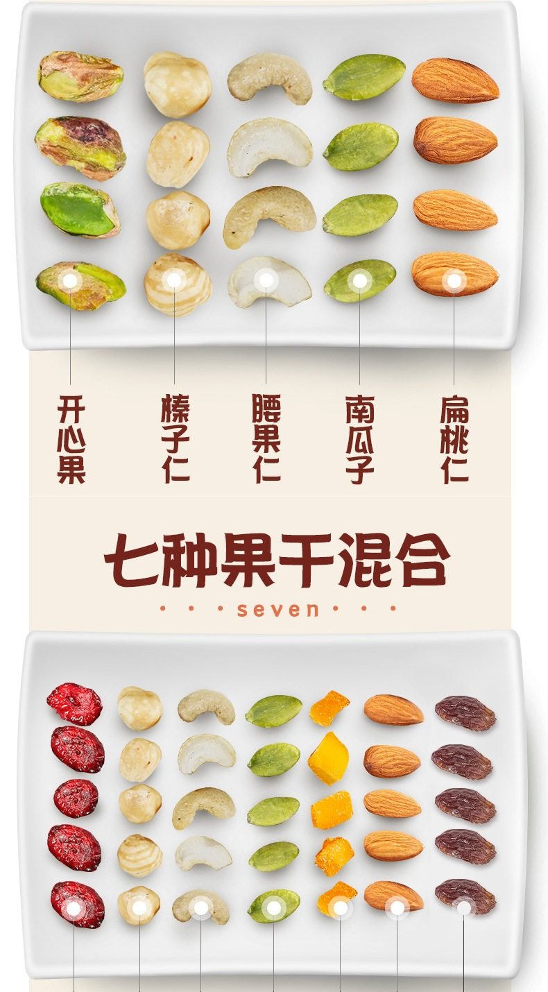 | Packaging specifications | Mixed dried fruits (nut cereal package) 250g*1 bag (dried fruit, nut and cereal ring combination),5 kinds of mixed pure nuts (including pistachios) 250g*1 bag,5 kinds of mixed pure nuts (including pistachios) 250g*2 bags,5 kinds of pure nuts (including pistachios) 2.5kg*1 bag [full box shipment],5 kinds of pure nuts (including pistachios) 2.5kg [10 aluminum foil bags included],7 kinds of mixed nuts 250g*1 bag (dried fruit and nut combination),7 kinds of mixed nuts 250g*2 bags (dried fruit and nut combination),7 kinds of mixed nuts 250g*4 bags (dried fruit and nut combination),7 kinds of mixed nuts 2.5kg*1 bag [full box shipment],7 kinds of mixed nuts 2.5kg [10 aluminum foil bags included],7 kinds of mixed nuts 12.5kg [full box batch 12.5kg],Mixed dried fruits (nut cereal package) 250g*2 bags (dried fruit and nut cereal ring combination),Mixed dried fruits (nut cereal package) 2.5kg*1 bag [full box batch 2.5kg],Mixed dried fruits (nut cereal package) 2.5kg*4 bags [full box batch 10kg] |