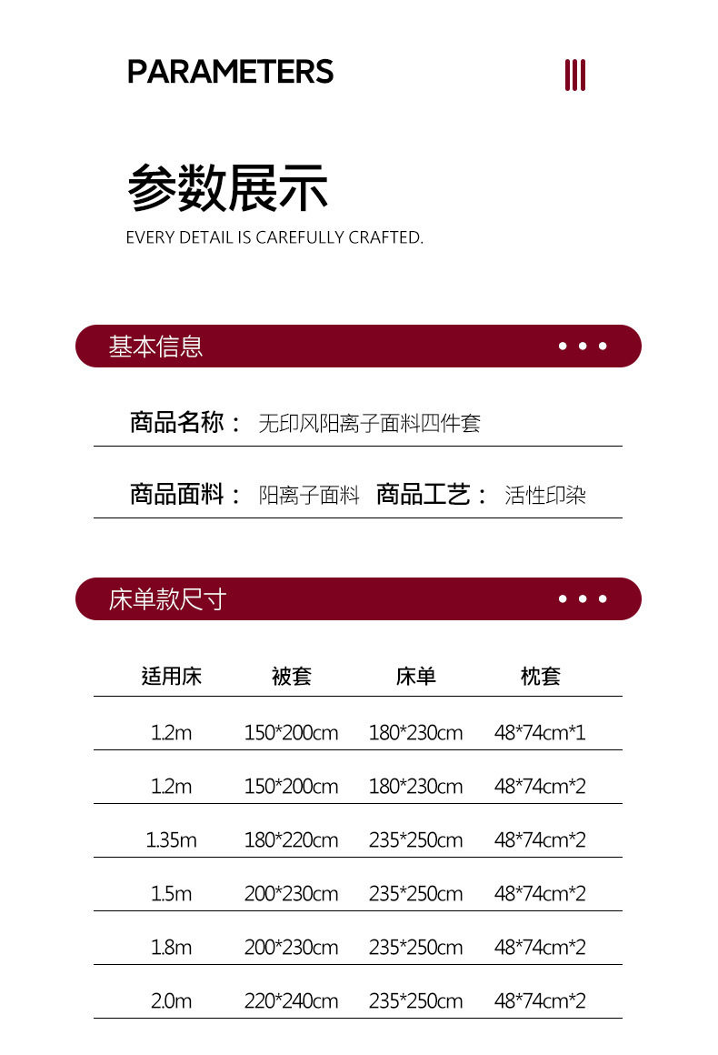 | Size specifications | 0.9-1.2m bed sheets three-piece set-quilt cover 150*200,1.2m bed sheet four-piece set-quilt cover 150*200,1.5m bed sheet four-piece set-quilt cover 150*200,1.8m bed sheet four-piece set-quilt cover 180*200,1.5m bed sheet four-piece set-quilt cover 200*230,1.8m bed sheet four-piece set-quilt cover 200*230,2.0m bed sheet four-piece set-quilt cover 220*240,1.2m fitted sheet three-piece set-quilt cover 150*200,1.2m fitted sheet set of four-quilt cover 150*200,1.5m fitted sheet set of four-quilt cover 150*200,1.5m fitted sheet set of four-quilt cover 180*220,1.8m fitted sheet set of four-quilt cover 180*220,1.5m fitted sheet set of four-quilt cover 200*230,1.8m fitted sheet set of four-quilt cover 200*230,1.8m extra large fitted sheet set of four-quilt cover 220*240,180*220cm single quilt cover,200*230cm single quilt cover,220*240cm single quilt cover |