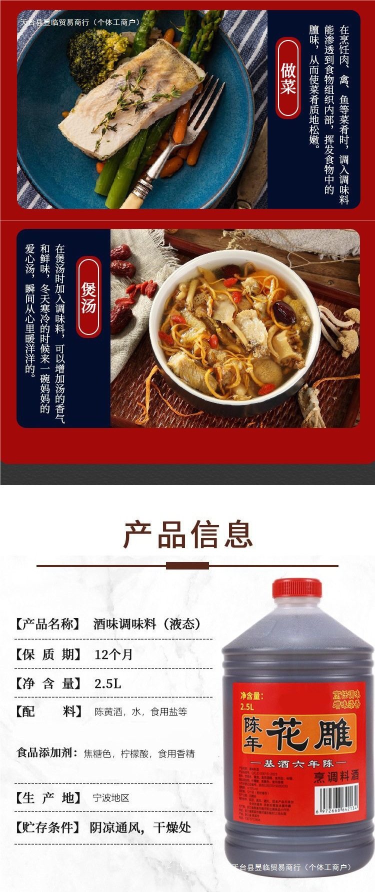 | Packaging specifications | New barreled cooking seasoning,New three-year flower carving cooking wine,Six-year-old huadiao cooking wine 2.5kg pack |