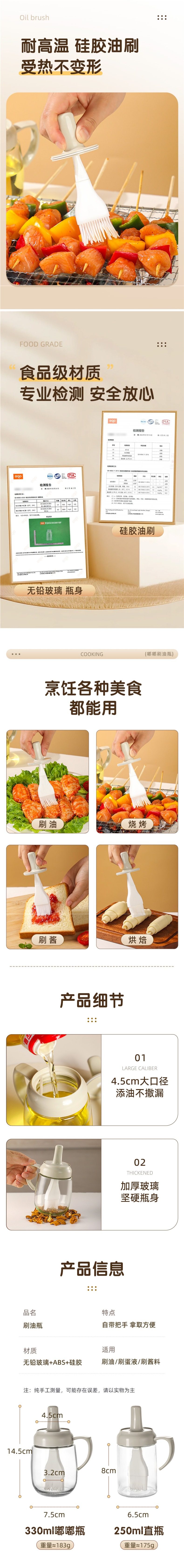 | Specifications | [pack of 1] oil bottle with handle - 250ml straight bottle,[1 pack] oil bottle with handle brush-330ml dudu bottle,[pancake two-piece set] 330ml dudu bottle + pancake spatula,[bbq two-piece set] 330ml dudu bottle + silicone food clip,[pack of 2] brush oil bottle with handle-330ml dudu bottle,[pancake two-piece set] 250ml straight bottle + pancake spatula,[bbq two-piece set] 250ml straight bottle + silicone food clip,[pack of 2] brush oil bottle with handle-250ml straight bottle,[pack of 3] brush oil bottle with handle-330ml dudu bottle,[pack of 3] oil bottle with handle brush-250m straight bottle,1 pack [classic white] high borosilicate glass,1 pack [outdoor green] high borosilicate glass |