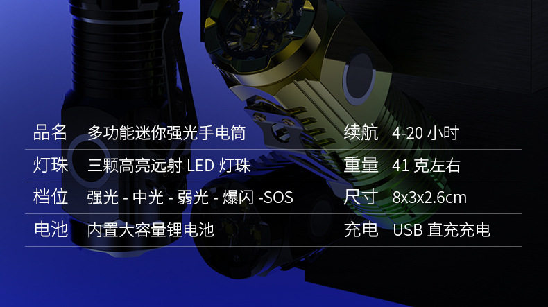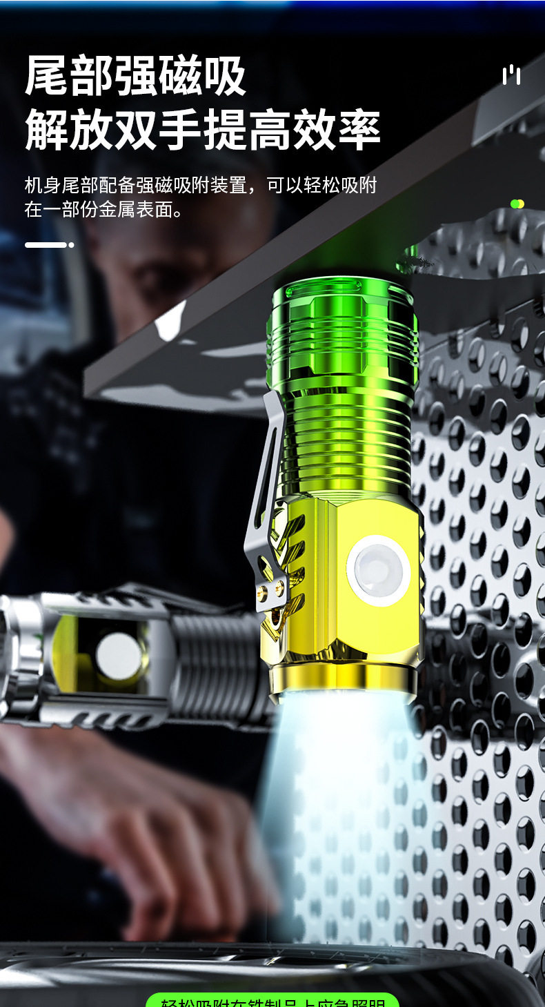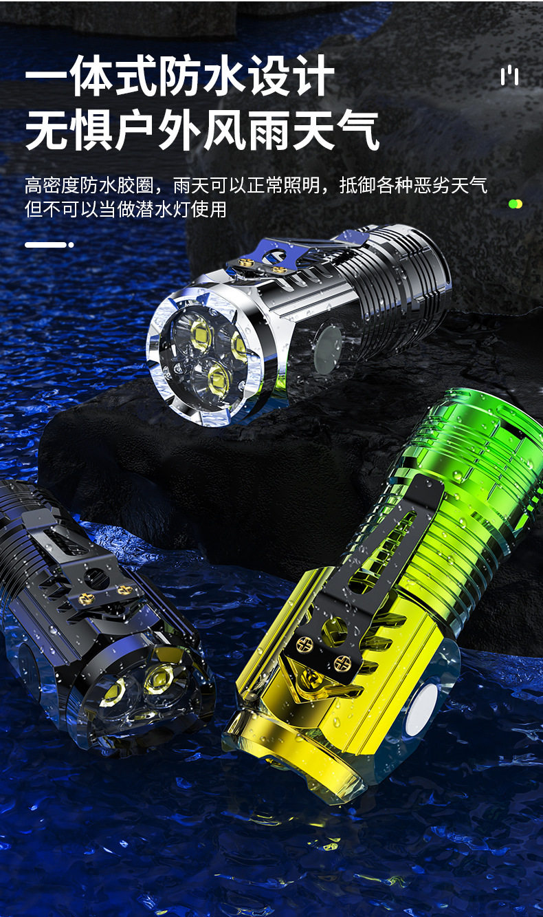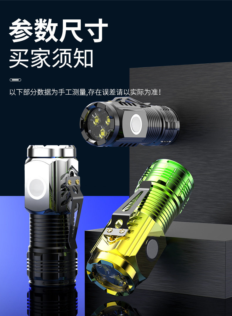 | Product specifications | Black three-eye flashlight [pen clip] without magnetic suction,Black three-eye flashlight [strong magnet + pen clip],Electroplated black three-eye flashlight [strong magnet + pen clip],Gradient silver three-eye flashlight [strong magnet + pen clip],Electroplated green three-eye flashlight [strong magnet + pen clip] |