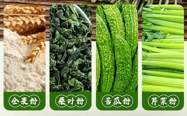 | Raw materials and ingredients | Wheat flour, 7% mulberry leaf powder, 6% celery juice, 5% bitter melon powder, drinking water, edible salt. |