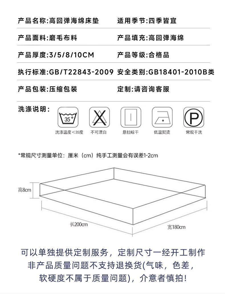 | Color | 3cm thick [high elasticity and soft style without cloth cover],3cm thick [high-density, hard style without cloth cover],3cm thick [high elasticity and soft random cloth cover],5cm thick [high elasticity and soft style without cloth cover],3cm thick [high-density and hard random cloth cover],5cm thick [high elasticity and soft random cloth cover],5cm thick [high-density, hard style without cloth cover],8cm thick [high elasticity and soft style without cloth cover],5cm thick [high-density and hard random cloth cover],8cm thick [high elasticity and soft random cloth cover],10cm thick [high elasticity and soft style without cloth cover],10cm thick [high elasticity and soft random cloth cover],8cm thick [high-density, hard style without cloth cover],8cm thick [high-density and hard random cloth cover],10cm thick [high-density, hard style without cloth cover],10cm thick [high-density and hard random cloth cover] |