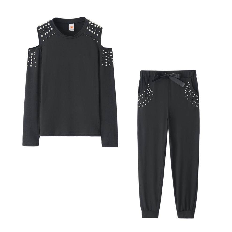2025 European and American Autum Aliexpress Hot Selling Off-Shoulder Sexy Beaded Pure Color Sports Round Neck Long-Sleeved Casual Suit