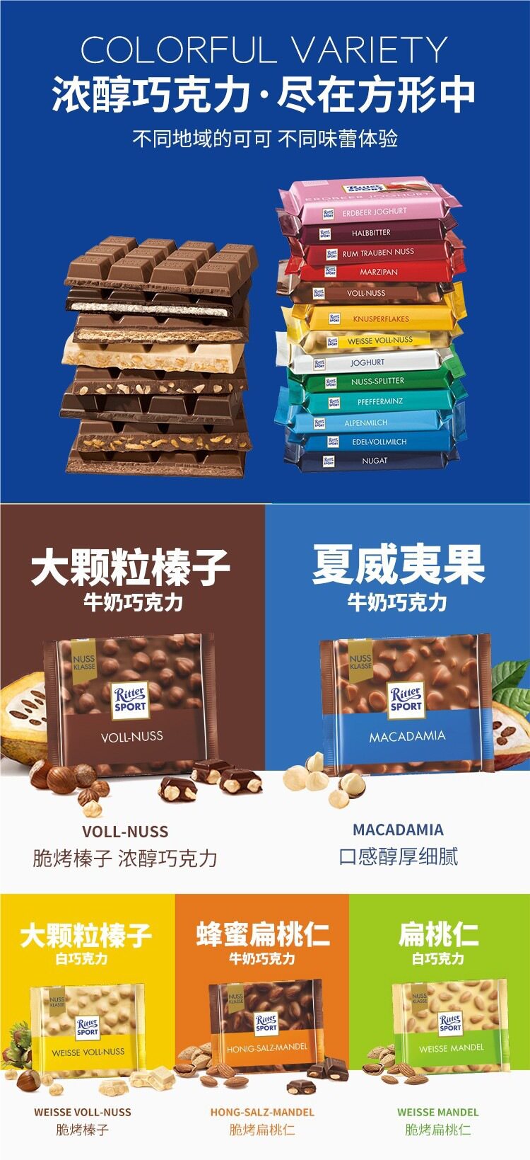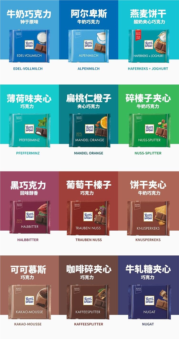 | Packaging specifications | 74% peruvian dark chocolate,61% nicaragua dark chocolate 100g,81% extra dark chocolate 100g,Milk chocolate 100g,50% dark chocolate 100g,Rum raisin hazelnut filling chocolate 100g,Strawberry yogurt flavored milk chocolate 100g,Alpine milk chocolate 100g,Almond milk chocolate 100g,Whole hazelnut milk chocolate 100g,Whole hazelnut white chocolate 100g,Hazelnut dark chocolate 100g,Cashew milk chocolate 100g,Raisin hazelnut milk chocolate 100g,Dark chocolate with almond and orange peel filling 100g,Corn crisp sandwich white chocolate 100g,Cocoa cream filled chocolate 100g,Yogurt flavored milk chocolate 100g,Salt baked cashew milk chocolate 100g,Salted caramel milk filled chocolate 100g,Dark chocolate milk 100g |