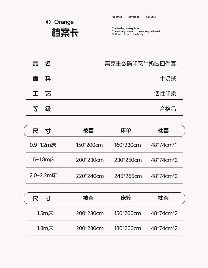 | Size specifications | 1.2m bed sheet three-piece set [suitable for 150*200 quilt core],1.5m bed sheet four-piece set [suitable for 200*230 quilt core],1.8m bed sheet four-piece set [suitable for 200*230 quilt core],2.0m bed sheet four-piece set [suitable for 220*240 quilt core],1.5m fitted sheet set of four [suitable for 200*230 quilt core],1.8m fitted sheet set of four [suitable for 200*230 quilt core],150*200cm single quilt cover [suitable for 150*200 quilt core],180*220cm single quilt cover [suitable for 180*220 quilt core],200*230cm single quilt cover [suitable for 200*230 quilt core],220*240cm single quilt cover [suitable for 220*240 quilt core] |