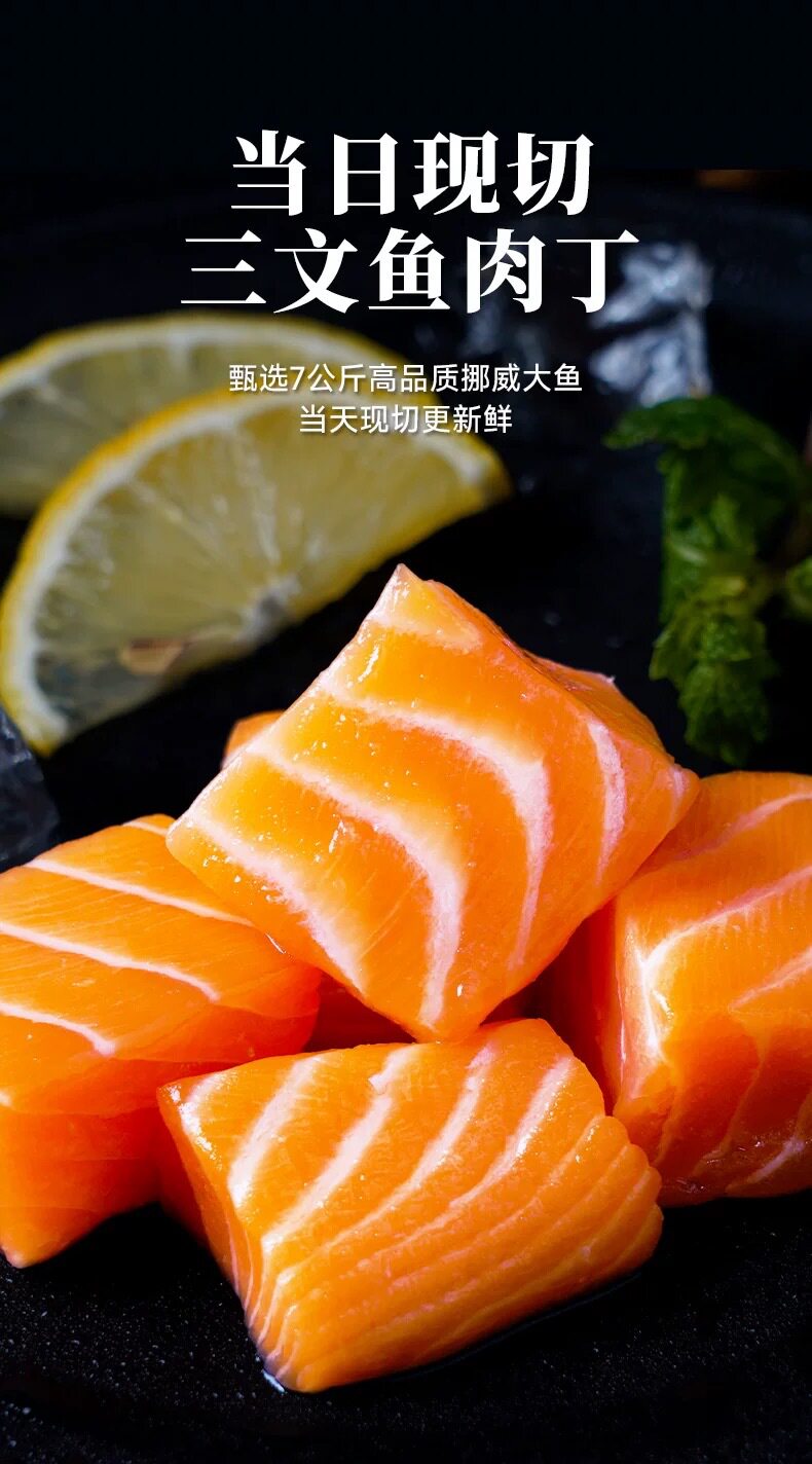 | Packaging specifications | Chilled salmon cubes 200g/box*2,Chilled salmon cubes 200g/box*3,Chilled salmon cubes 200g/box*4,Chilled salmon cubes 200g/box*5 |