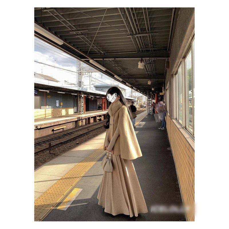 Overseas Lady's Autumn and Winter Elegant Cape Jacket + Fur Collar + Slim Long-Sleeved Skirt Three-Piece Set