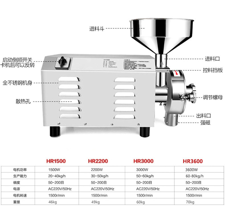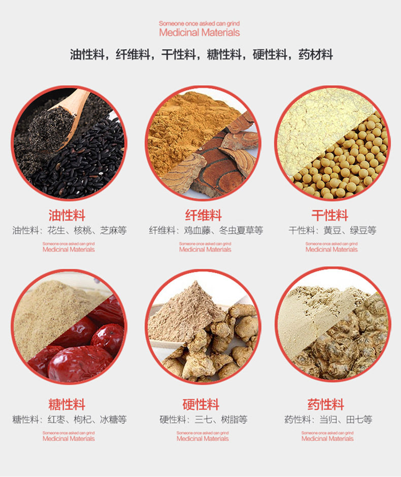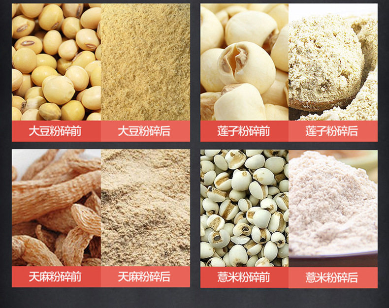 | Applicable materials | Whole grains,Nuts,Dry and wet rice,Dry and wet forage, rice, whole grains, chili peppers,Plant food,Chinese medicinal materials/tea/grains,Peanut butter, sesame paste, almond butter, pistachio butter, cashew butter, cocoa butter, pecans |