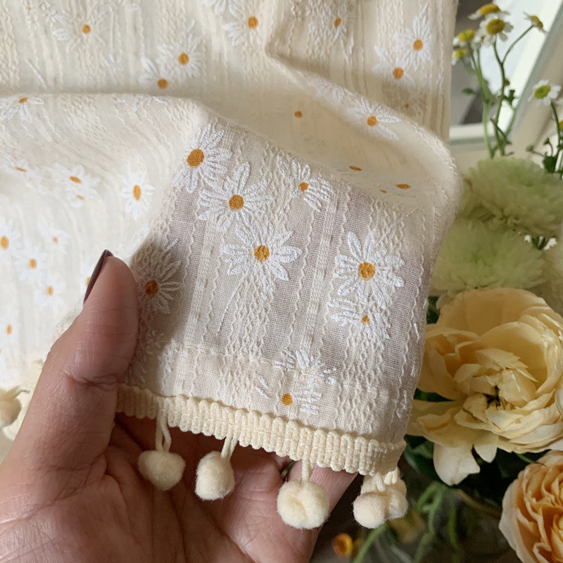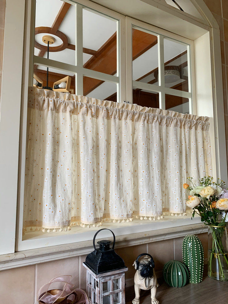 Korean Pastoral French Daisy Floral Cotton and Linen Curtain Fabric, Light-Transmitting but Not See-Through, No-Punch Magic Tape Short Curtain, Ginger Tea