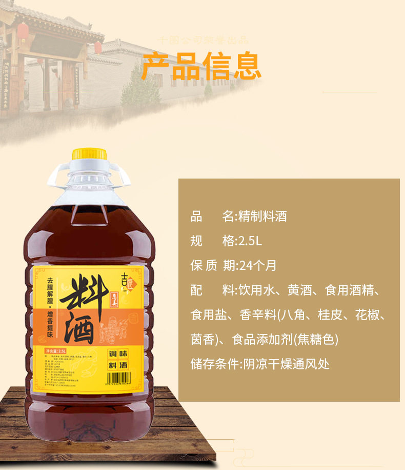 | Packaging specifications | Cooking wine 2.5kg *1 barrel,800ml cooking wine (1 bottle),800ml cooking wine*2 pots,800ml cooking wine*3 pots |
