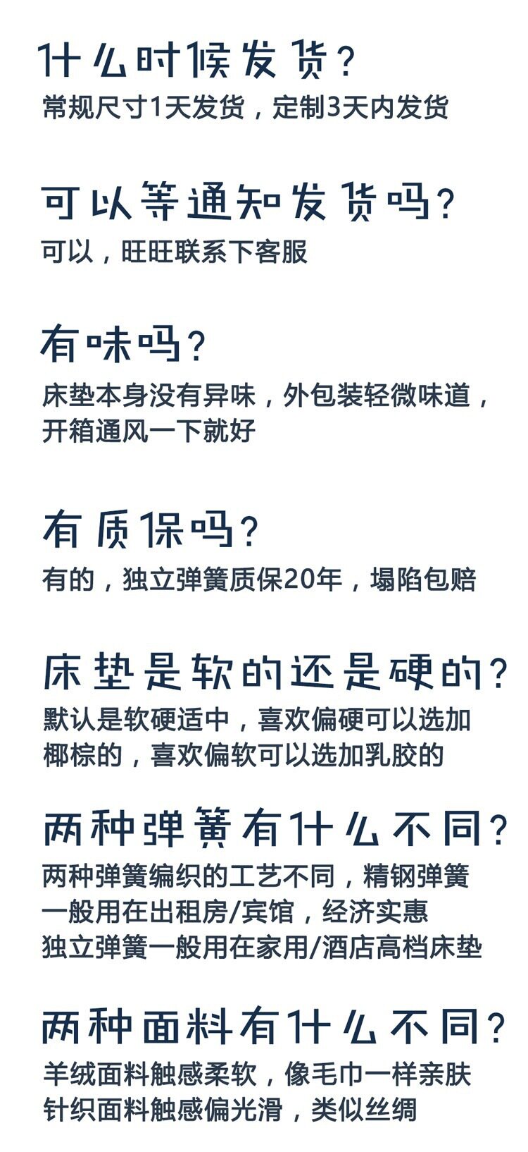 | Color | Knitted fabric + stainless steel spring, about 20cm, moderate softness and hardness,Knitted fabric + stainless steel spring + 3e coconut palm, about 22cm hard spine protector,Knitted fabric + stainless steel spring + natural latex, about 22cm soft,Knitted fabric + independent spring, about 20cm, moderate softness and hardness,Knitted fabric + independent spring + 3e coconut palm, about 22cm, hard spine protection,Knitted fabric + independent spring + natural latex, about 22cm soft,Yunduo cashmere fabric + stainless steel spring, about 20cm, moderate softness and hardness,Yunduo cashmere fabric + stainless steel spring + 3e coconut palm, about 22cm hard spine protector,Yunduo cashmere fabric + stainless steel spring + natural latex, about 22cm, soft,Yunduo cashmere fabric + independent spring, about 20cm, moderate softness and hardness,Yunduo cashmere fabric + independent spring + 3e coconut palm, about 22cm, hard spine protection,Yunduo cashmere fabric + independent spring + natural latex, about 22cm, soft,Yunduo cashmere fabric + independent spring + latex coconut palm, about 23cm soft and hard double-sided,Yunduo cashmere fabric + independent compression spring, about 12cm, moderate softness and hardness,Yunduo cashmere fabric + independent compression spring + 3e coconut palm, about 14cm hard spine protection,Yunduo cashmere fabric + independent compression spring + latex, about 14cm soft,Cloud cashmere + independent compression spring + latex coconut palm, about 15cm soft and hard double-sided,Yunduo cashmere fabric + silent bag spring, about 20cm, moderate softness and hardness,Cloud cashmere fabric + silent bag spring + 3e coconut palm, about 22cm hard spine protection,Yunduo cashmere fabric + silent bag spring + latex, about 22cm soft,Cloud cashmere + silent bag spring + latex coconut palm, about 23cm soft and hard double-sided |