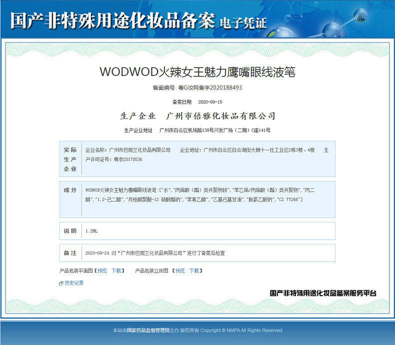 | Non-special cosmetics registration certificate number | Guangdong g makeup network preparation number 2020188493 |