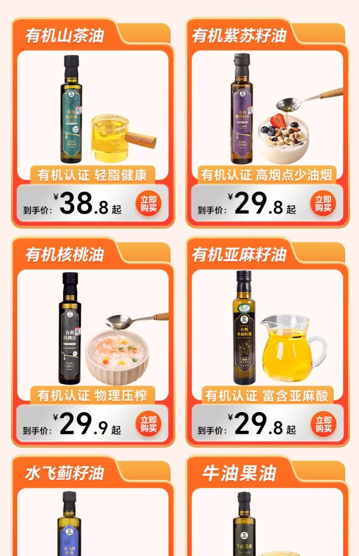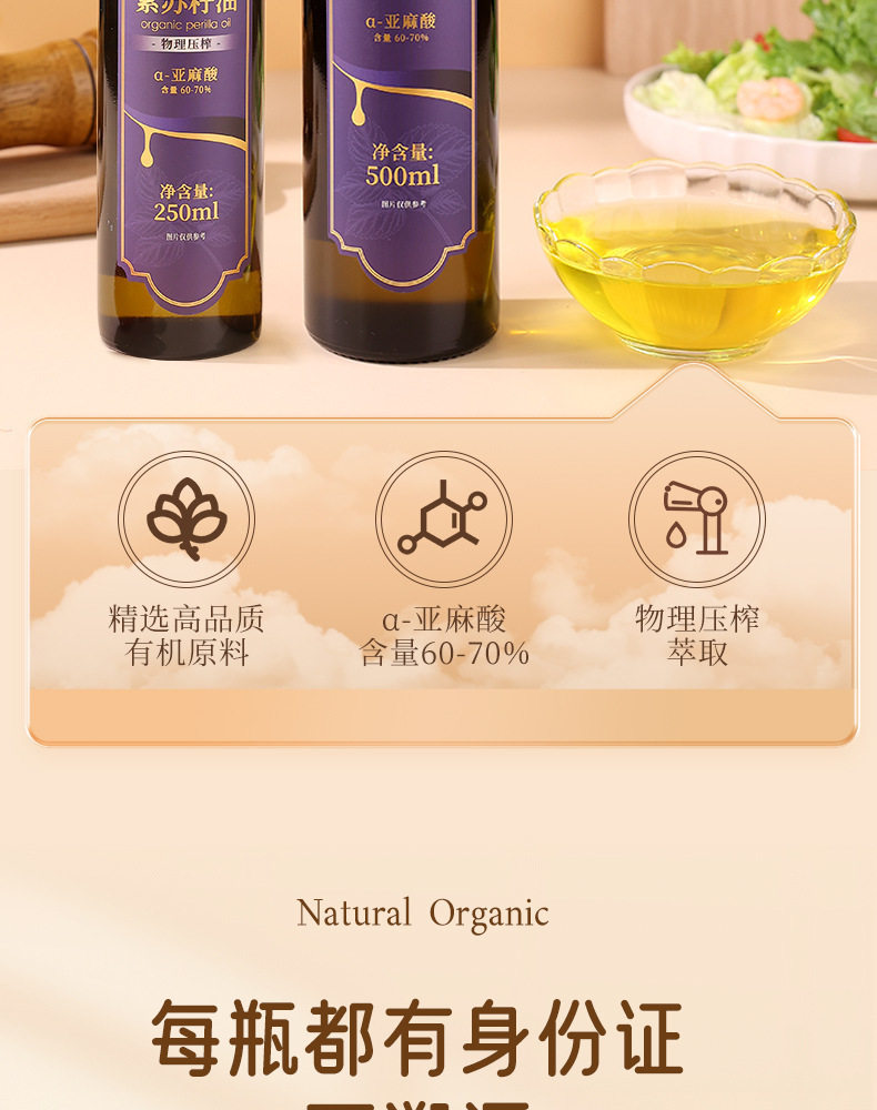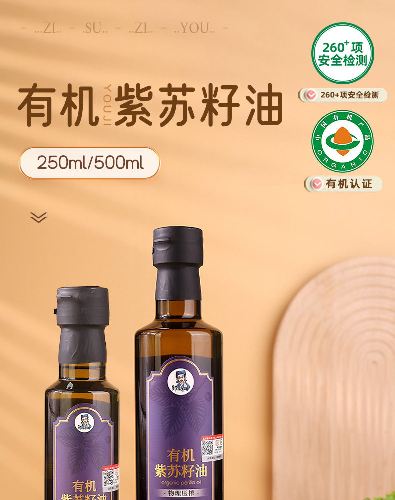 | Packaging specifications | Organic perilla seed oil 250ml*1 bottle,Organic perilla seed oil 250ml*2 bottles,Organic perilla seed oil 250ml*3 bottles,Organic perilla seed oil 250ml*4 bottles,Organic flaxseed oil 250ml*1 bottle,Organic flaxseed oil 250ml*2 bottles,Organic flaxseed oil 250ml*3 bottles,Organic flaxseed oil 250ml*4 bottles,Perilla seed oil + flaxseed oil 250ml 1 bottle each |
