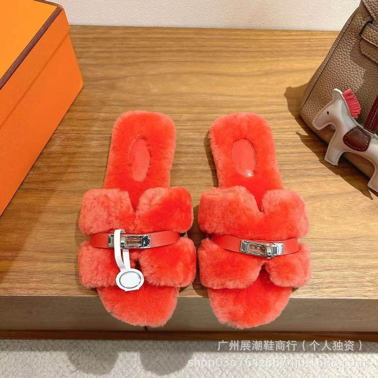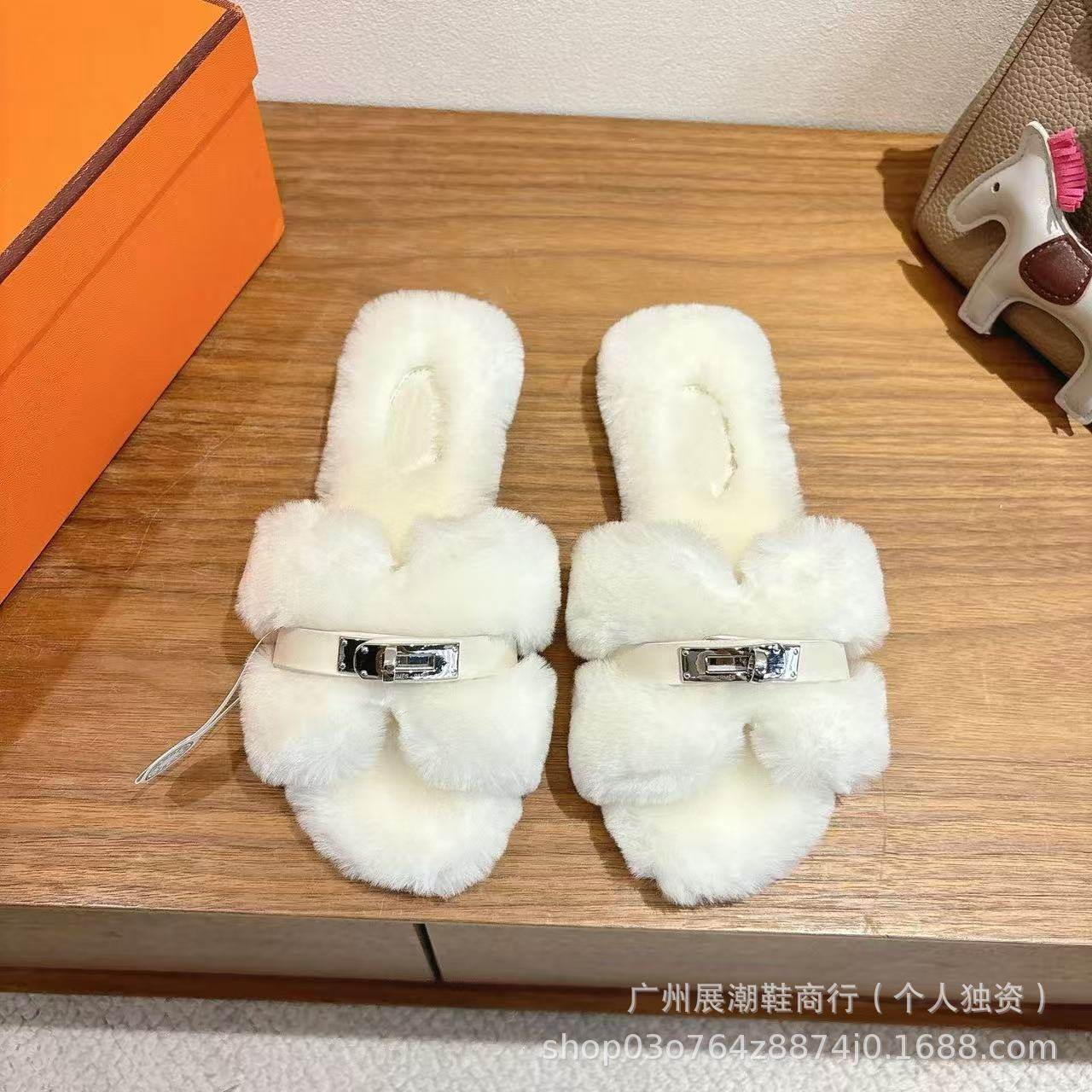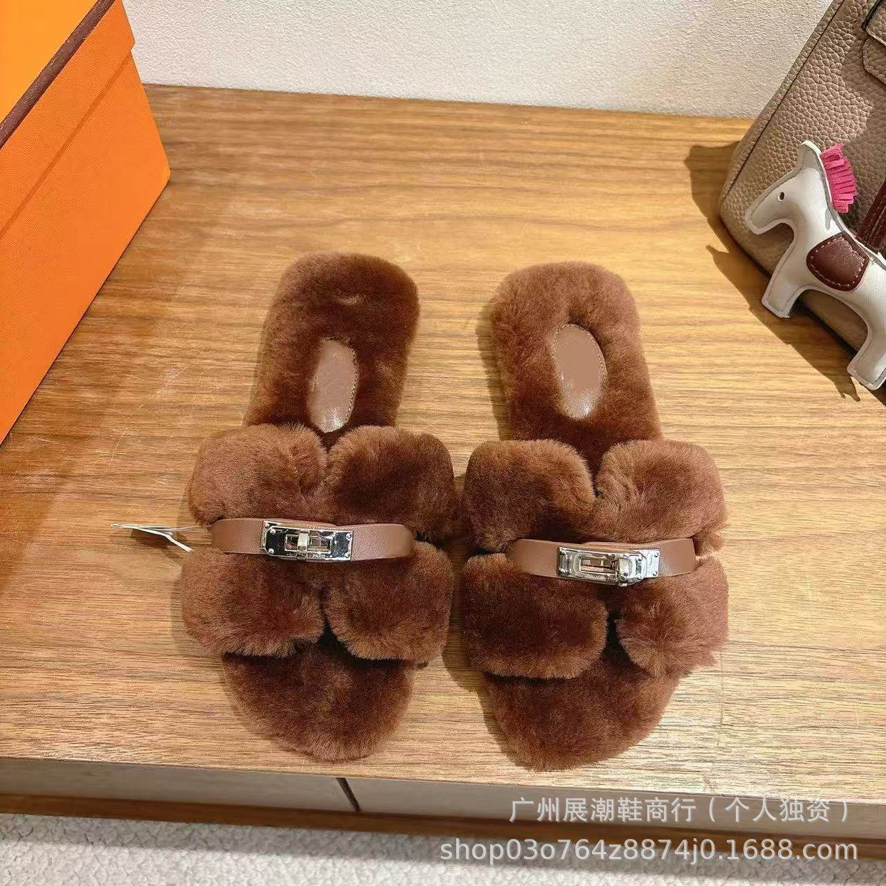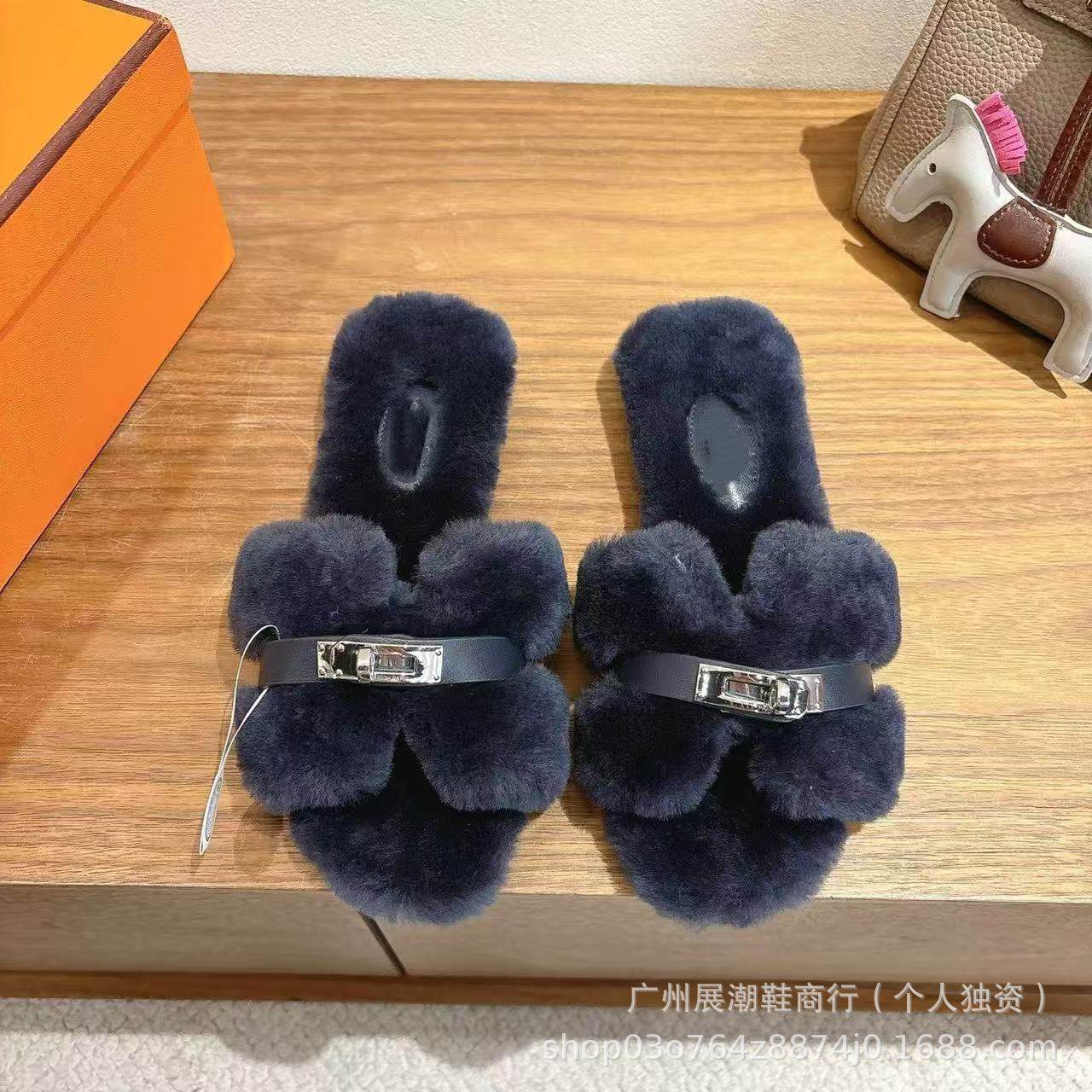 25 Autumn/Winter New Hhh Genuine Fur Slippers for Women, Versatile Plush Warm Metal Buckle with Fleece, Flat Open-Toe for Outdoor Wear