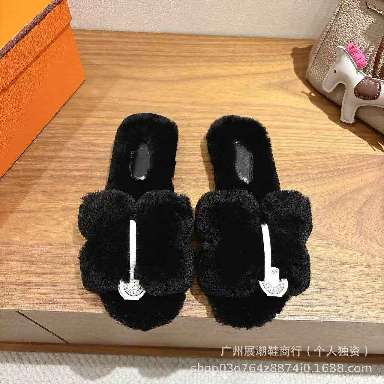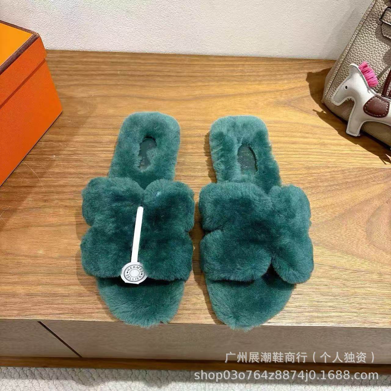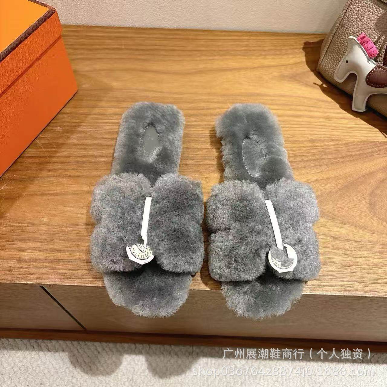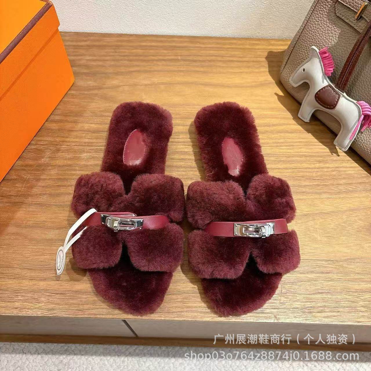 25 Autumn/Winter New Hhh Genuine Fur Slippers for Women, Versatile Plush Warm Metal Buckle with Fleece, Flat Open-Toe for Outdoor Wear