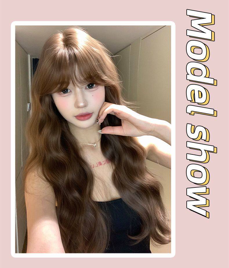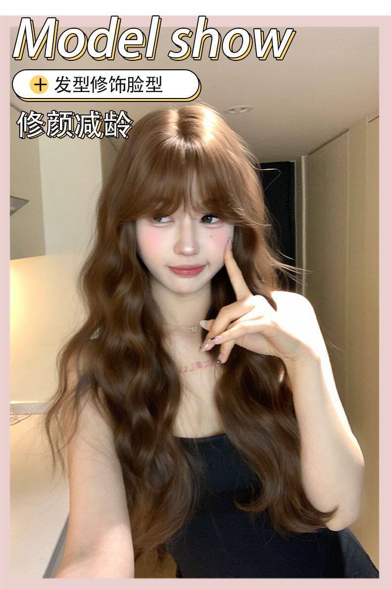 Caramel Chestnut Wool Curly Bangs Wig for Women with Long Hair, Natural Middle-Parted Egg Roll, Autumn and Winter Lazy Long Curly Hair Full Head