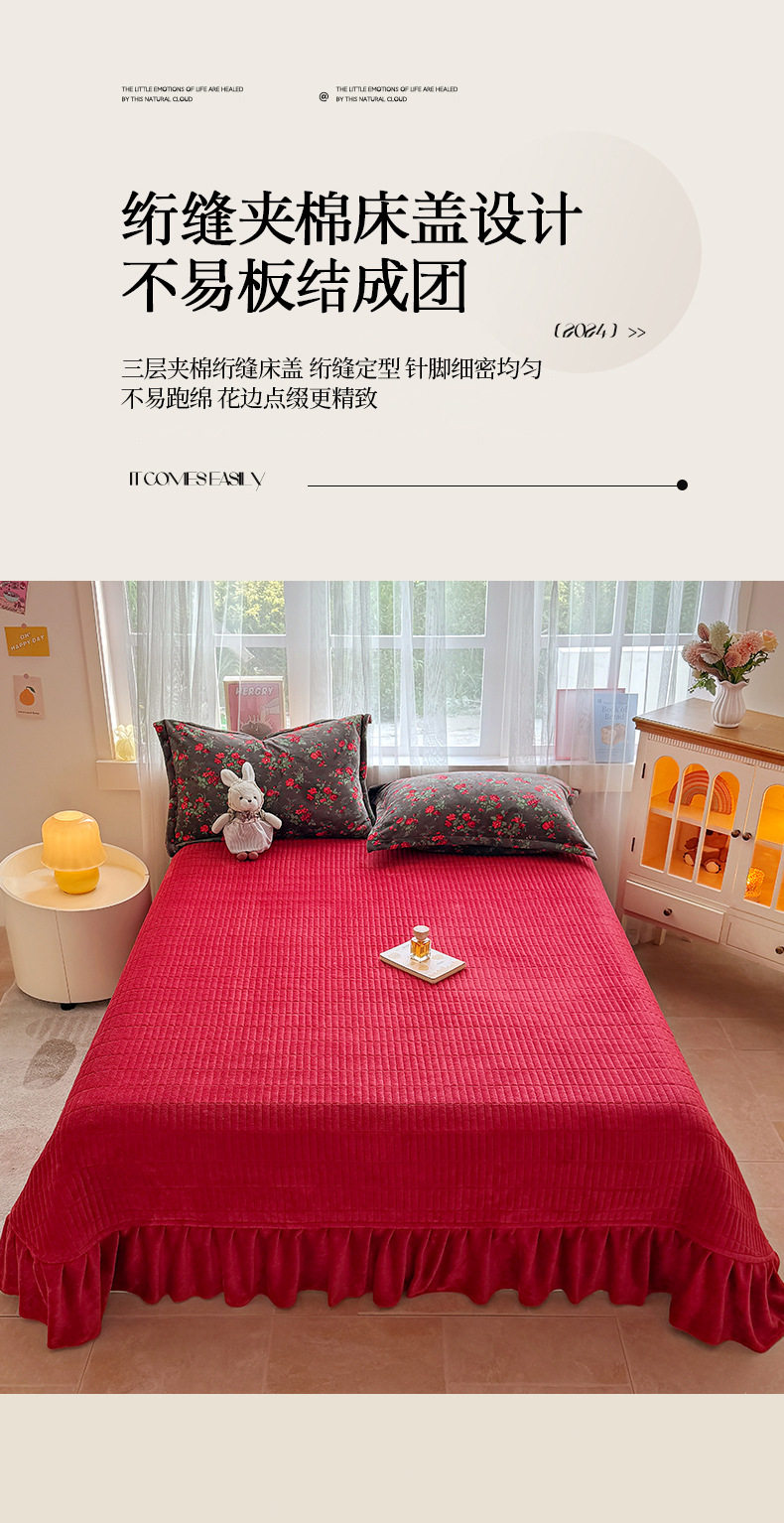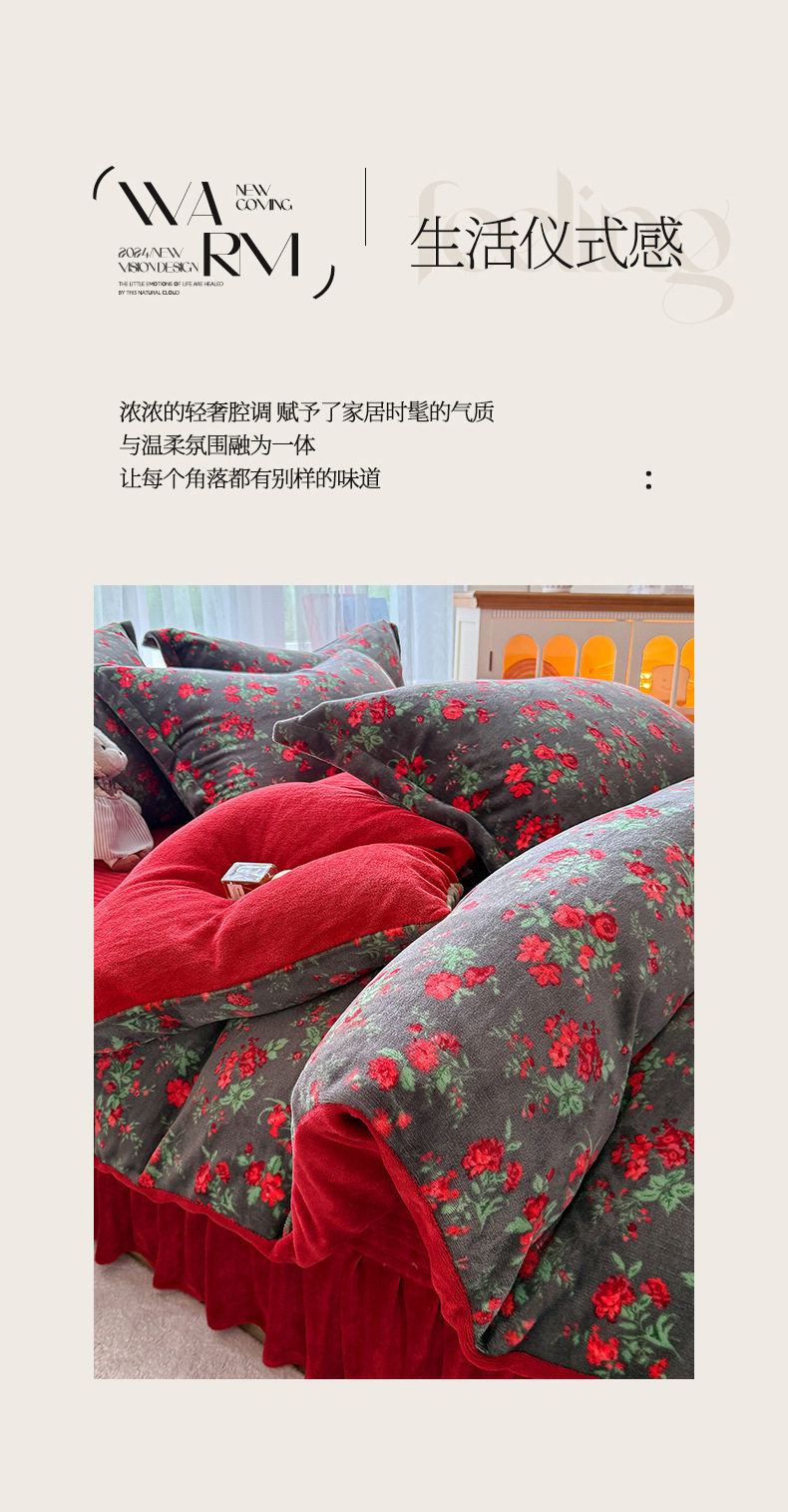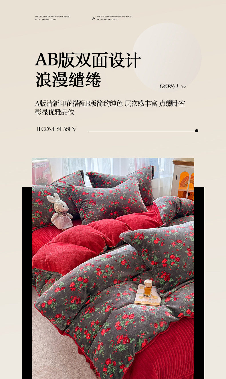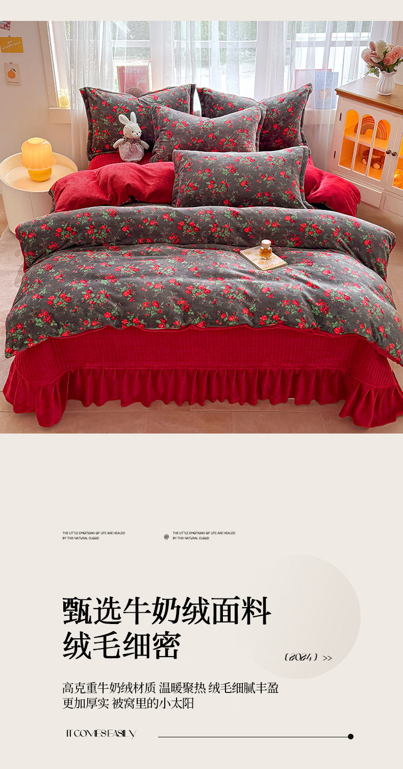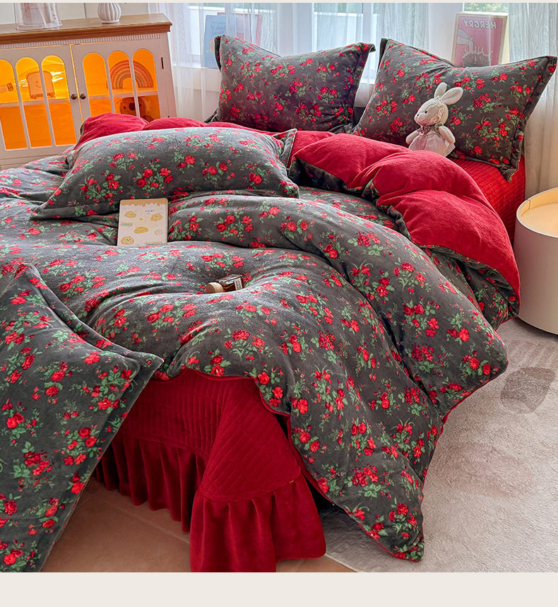New Milk Velvet Thickeneded Bed Cover Four-Piece Set Winter Coral Velvet Small Floral Quilt Cover Fleece-Lined Bed Bed Sheets Three-Piece Set