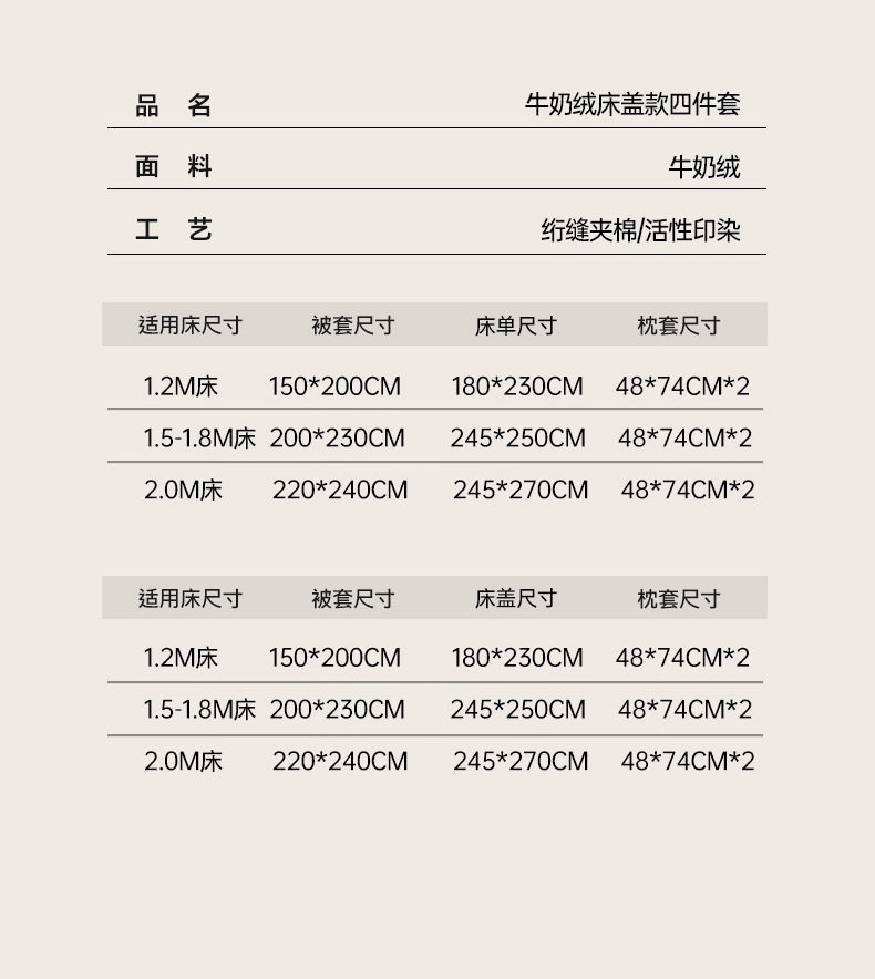 | Size specifications | 1.2m bed sheet four-piece set, quilt cover {150*200cm bed sheet 180*230cm pillowcase*2},1.5/ 1.8m four-piece bed sheet set, quilt cover {200*230cm bed sheet 245*250cm pillowcase*2},2m bed sheet four-piece set {quilt cover 220*240cm bed sheet 245*270cm pillowcase*2},1.2mi bed cover four-piece set quilt cover {150*200cm bed cover 180*230cm pillowcase*2},1.5/ 1.8m four-piece bed cover set {quilt cover 200*230cm bed cover 245*250cm pillowcase*2},2m four-piece bed cover set {quilt cover 220*240cm bed cover 245*270cm pillowcase*2} |