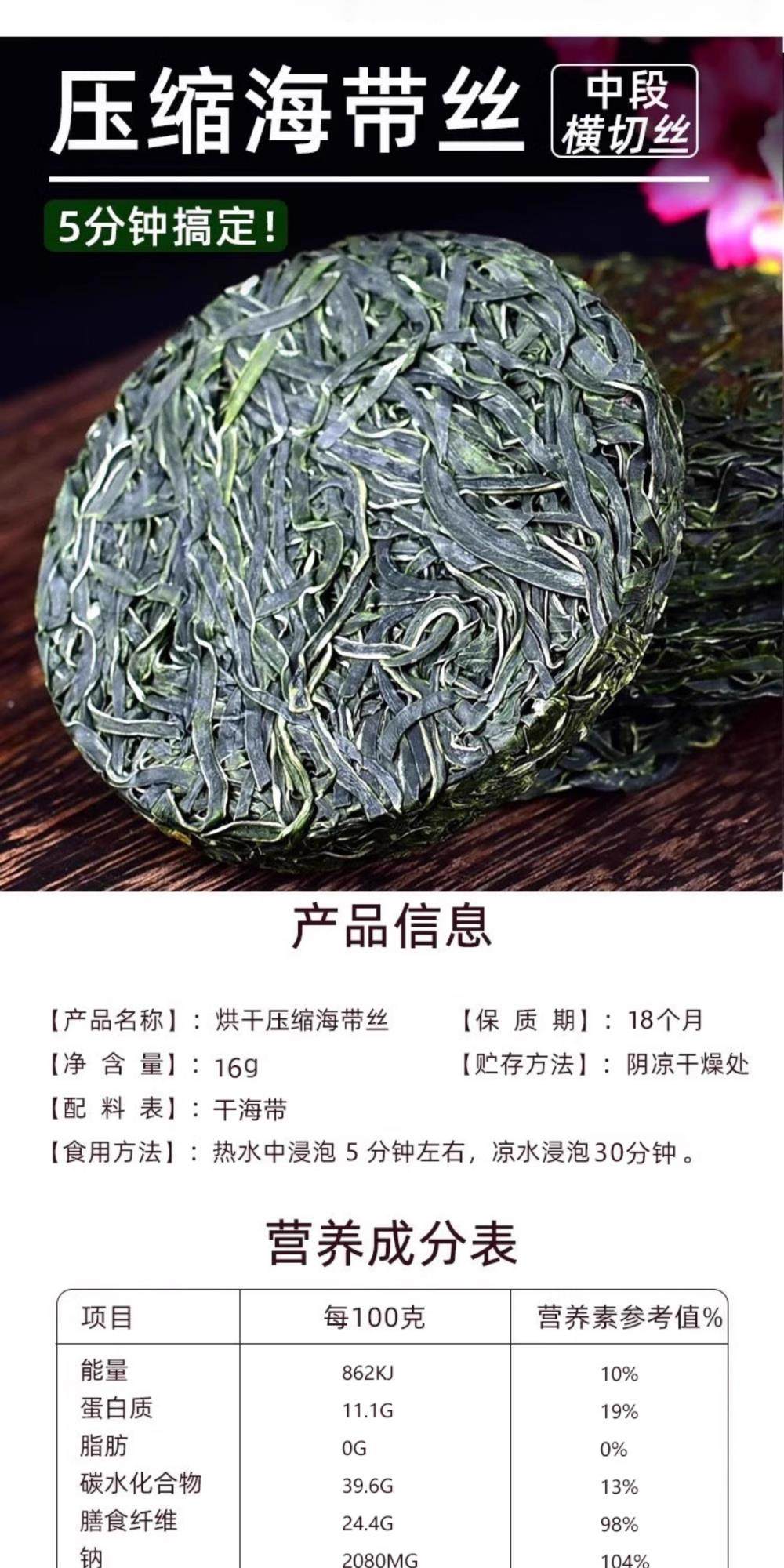 | Packaging specifications | 10g-5 pieces of compressed kelp silk [early adopter pack! 】,10g-10 pieces of compressed kelp silk [high quality! 】,10g-compressed kelp silk 30 pieces [manufacturer supply],10g-50 pieces of compressed kelp silk [choice for repeat customers! 】,22g-5 pieces of compressed kelp silk [early adopter pack! 】,22g-10 pieces of compressed kelp silk [high quality! 】,22g-30 pieces of compressed kelp silk [manufacturer supply],22g-50 pieces of compressed kelp silk [choice for repeat customers! 】 |