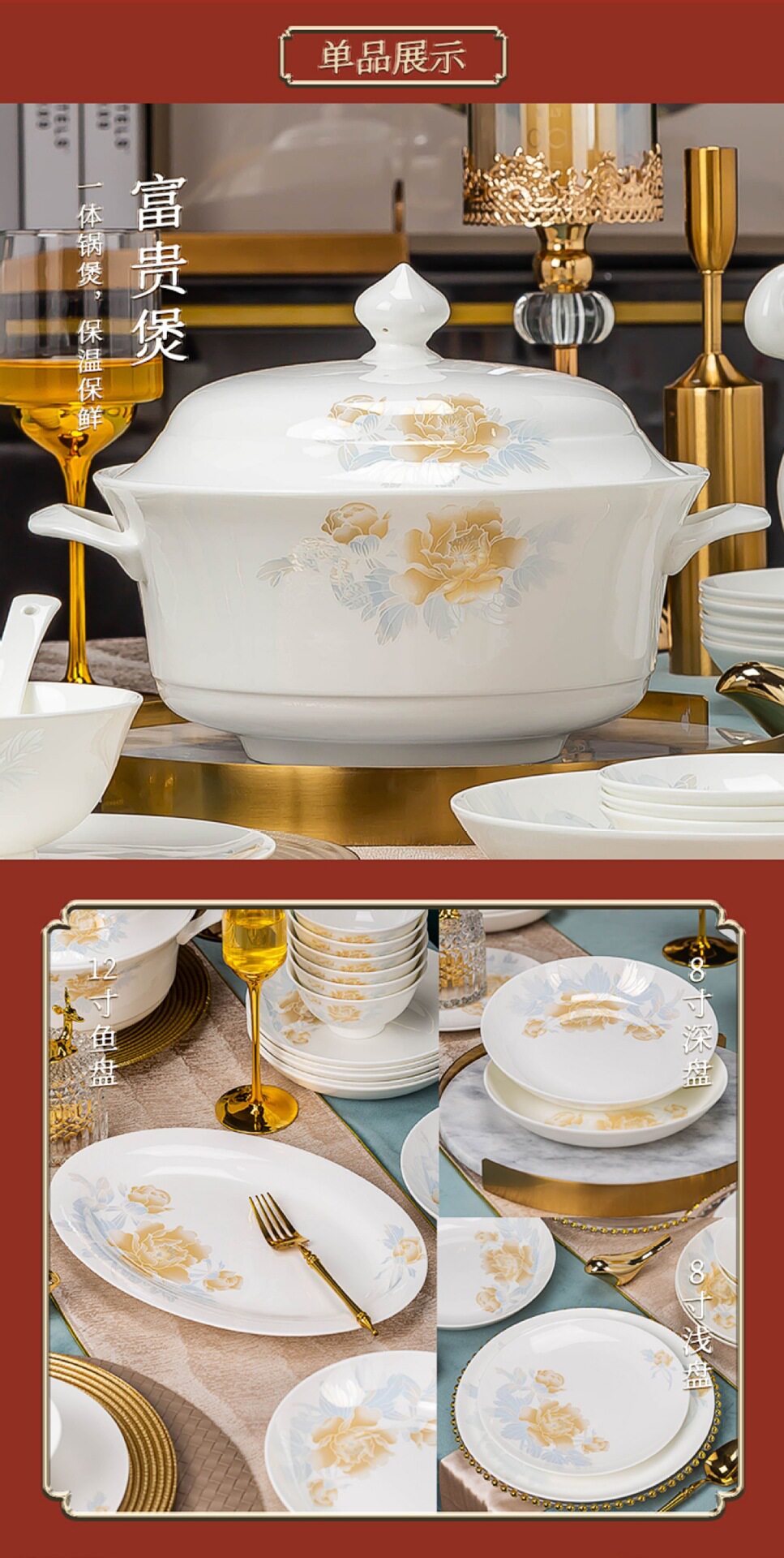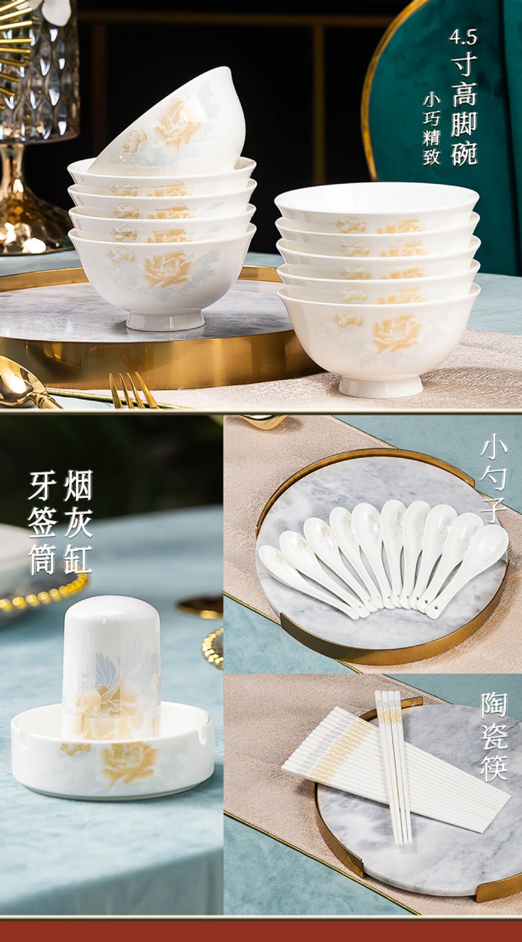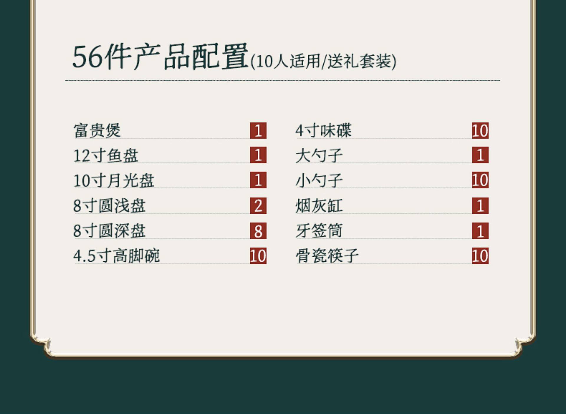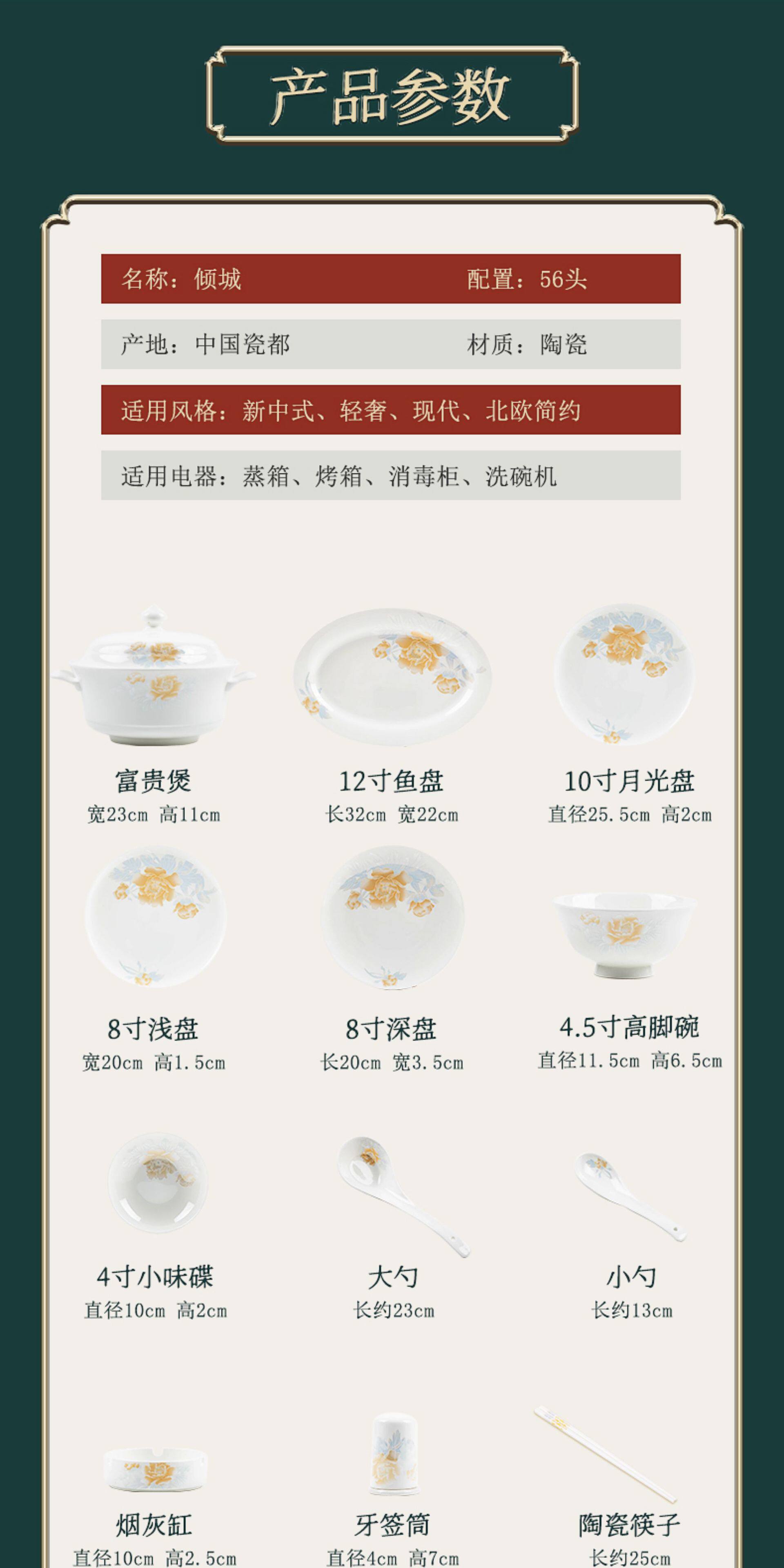 | Color | +[special offer] 1 fugui castle + 1 large spoon*,+ 4.5inch 6 golden bell bowls*,+ 4.5inch 10 golden bell bowls*,+ 4.5inch 10 tall bowls*,+ 5inch 10 tall bowls*,+ 6inch 4 noodle bowls*,+ 6inch 6 noodle bowls*,+ 6inch 10 noodle bowls*,+ 8inch soup bowl [free spoon]*,+ 8inch discs 4*,+ 8inch discs 6*,+ 8inch discs 10*,+ 7.5inch square plate 4*,+ 7.5inch square plate 6 pieces*,+ 7.5inch square plates of 10*,+ 10inch steak plate1pcs*,+ 12inch fish plate 1*,+ 4inch flavored dishes 6 pack*,+ 4inch flavor plates, 10 pieces*,+ 6inch bone plates 6 pack*,+ 6inch bone plates, 10 pieces*,+10 small spoons*,+6 small spoons*,+1 tablespoon* |