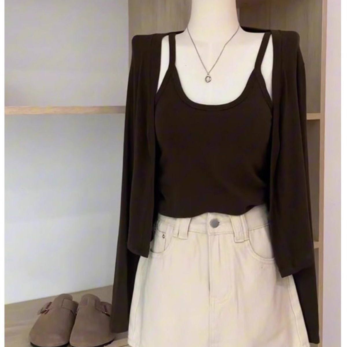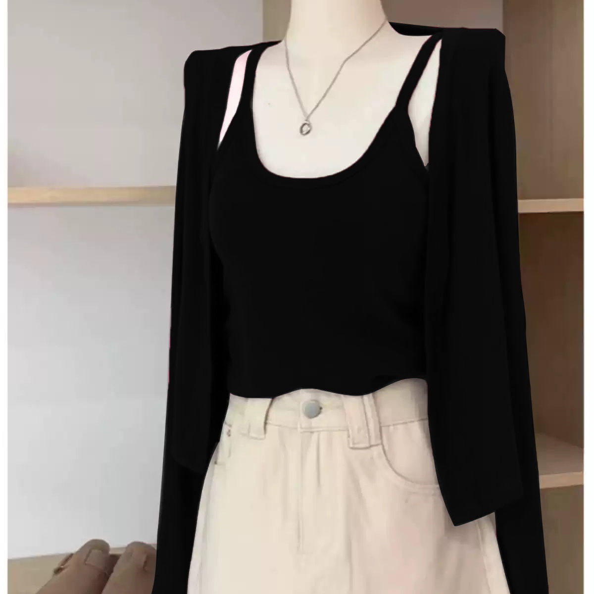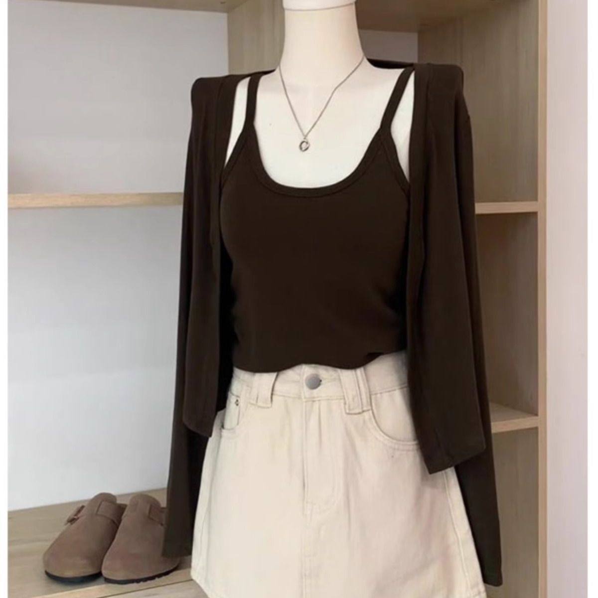 Modal Cotton Spring Sleeveless Suspender Cardigan Two-Piece Suit for Women Slimming Look Shawl Long-Sleeved Slim Top Outer Wear