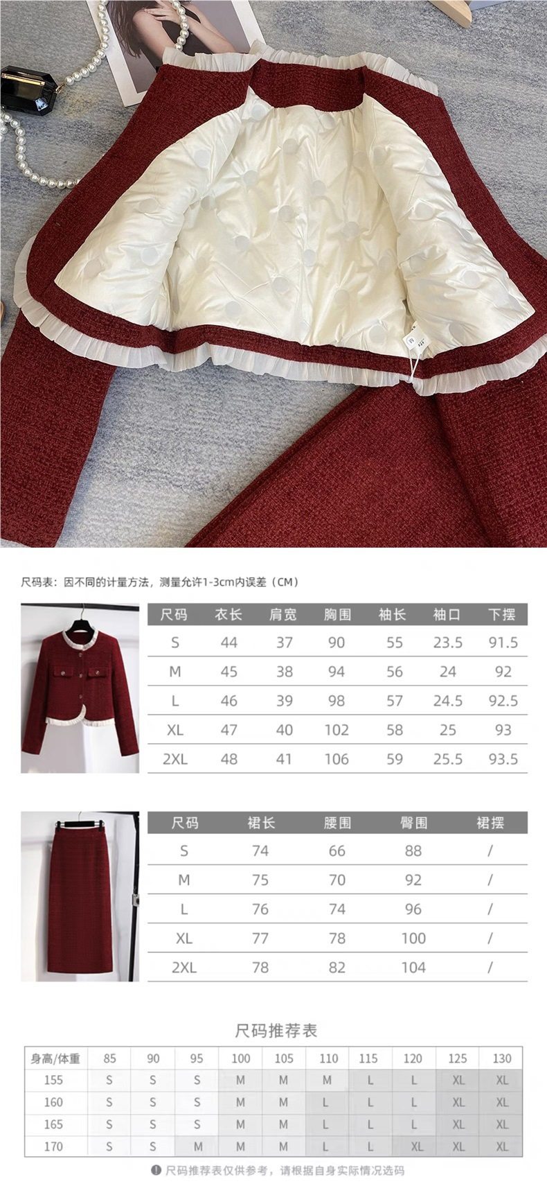 | Color | Regular burgundy thin lining outwear one piece,Regular black thin lining jacket,Burgundy down tops down outwear one piece,Black down tops down outwear one piece,Burgundy top and skirt thin two-piece set,Black top and skirt thin two-piece set,Burgundy two-piece set with thickened down lining,Black two-piece set with thickened down lining |