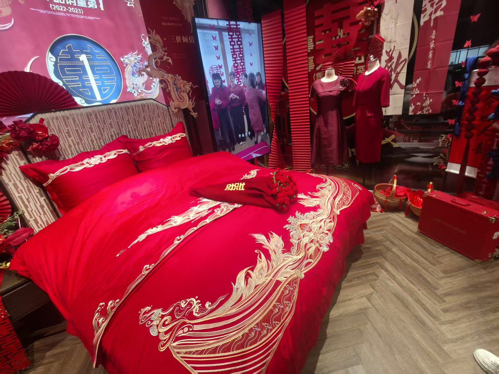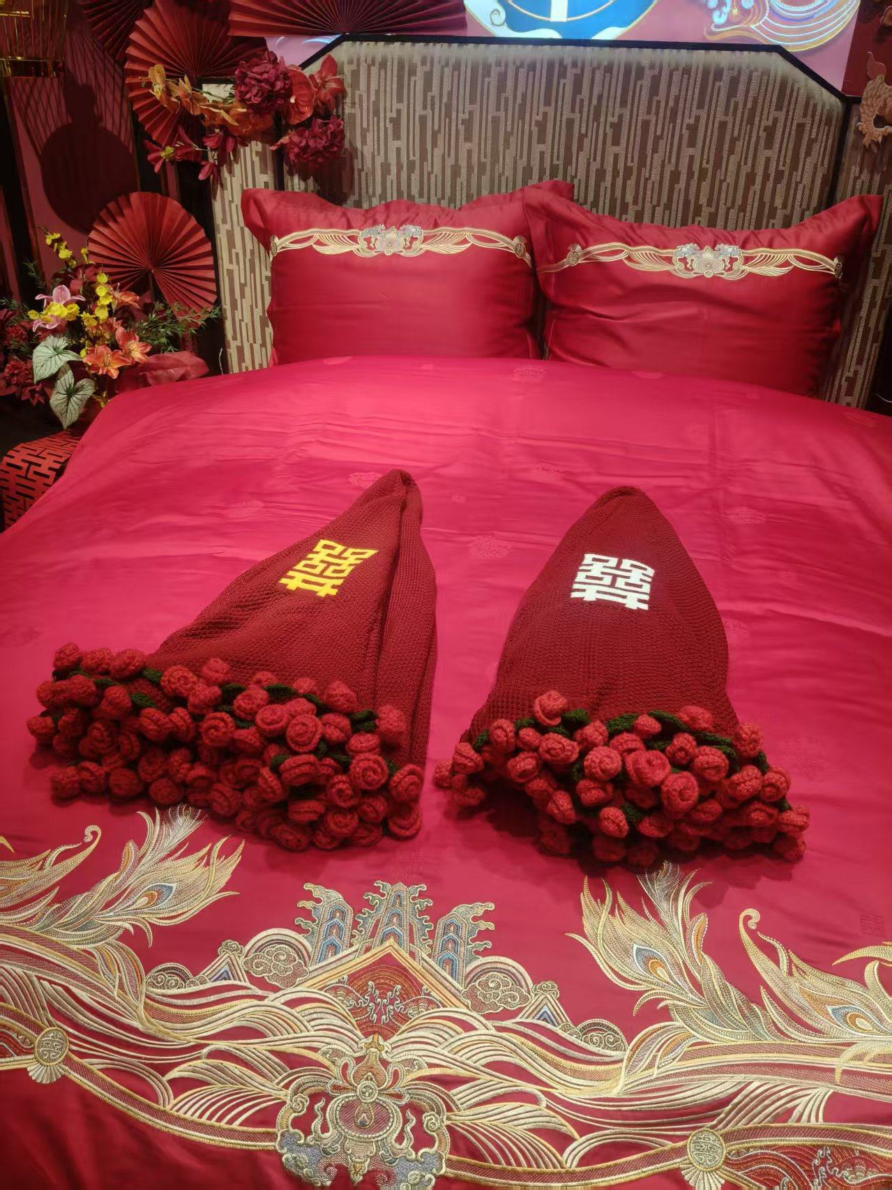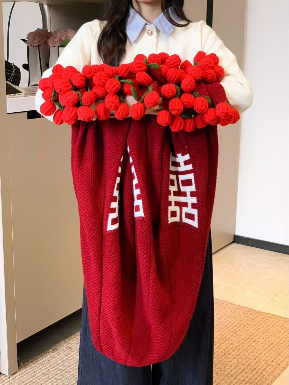 Finished Product: Double Happiness Rose Bouquet Blanket for Engagement and Wedding, Bride Gift, New Chinese Style Double Happiness Blanket Shawl Cover Blanket