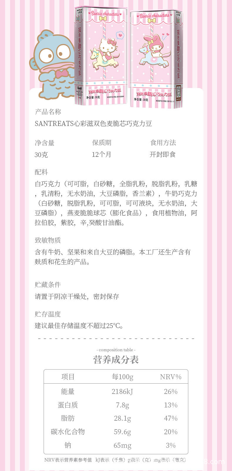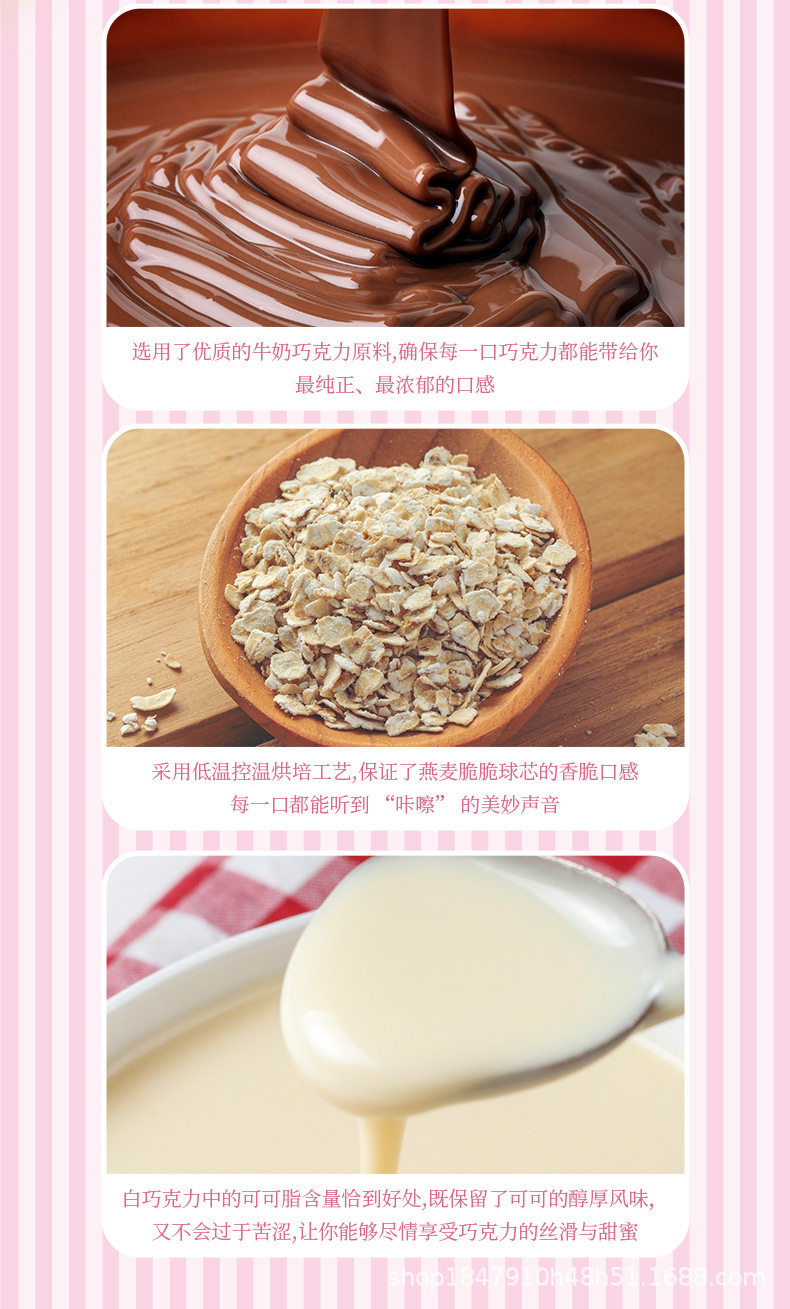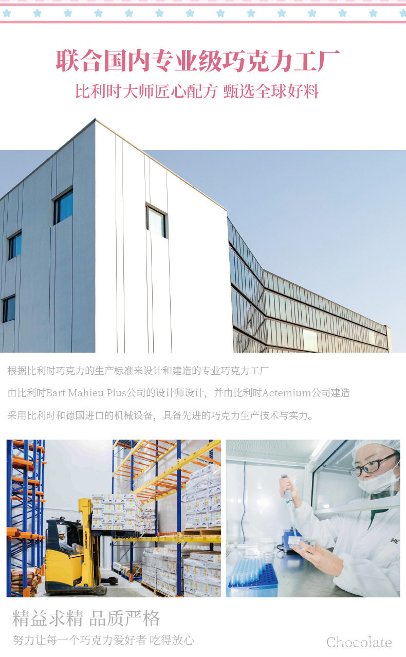 | Raw materials and ingredients | White chocolate (cocoa butter, white sugar, whole milk powder, skim milk powder, lactose, whey powder, anhydrous butter, soy lecithin, vanillin), milk chocolate |