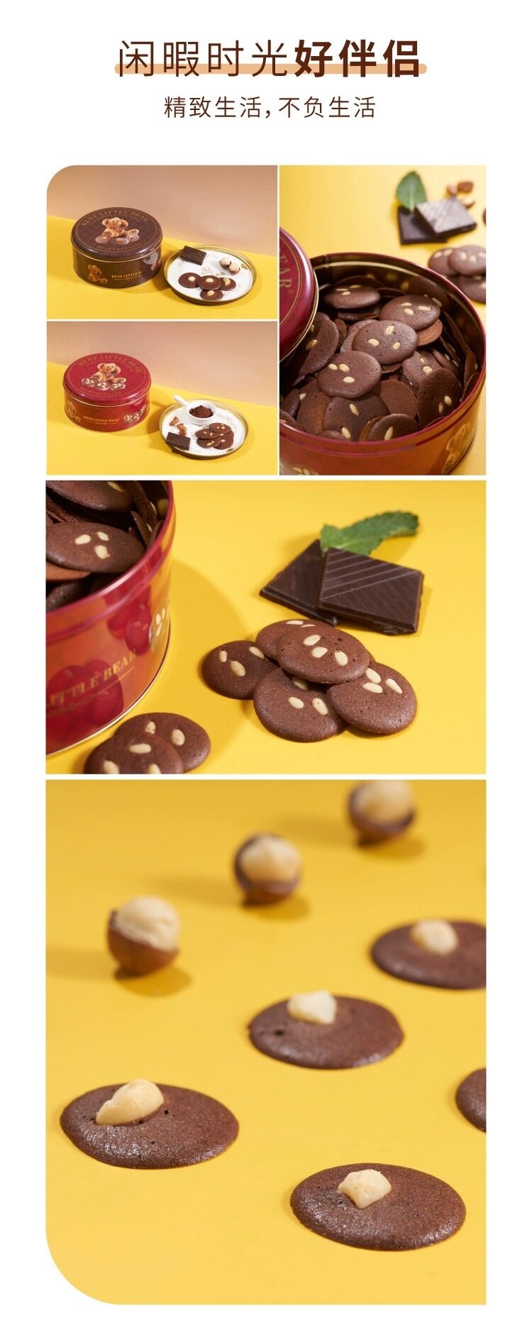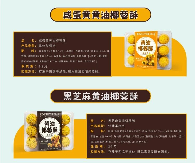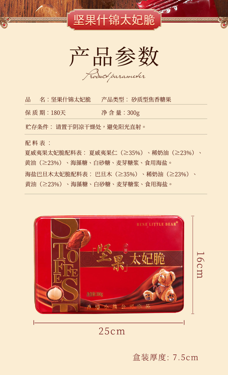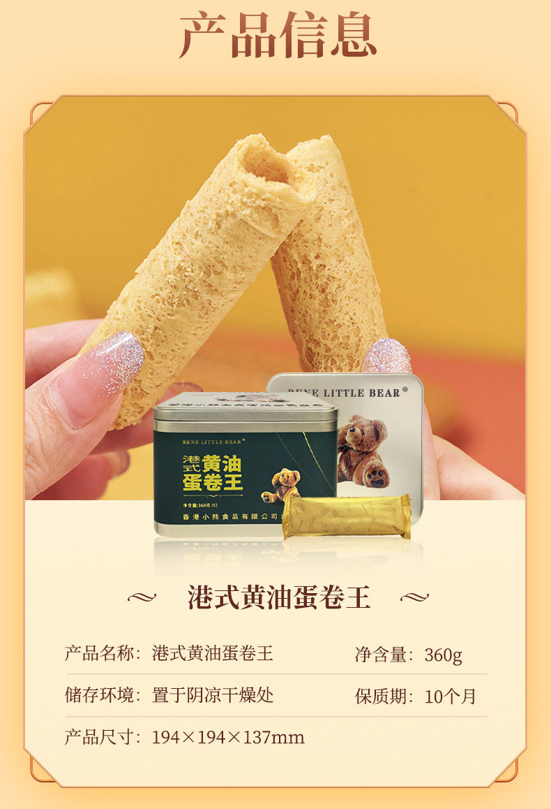 | Packaging specifications | Little bear flower song (mixed) 505g/box,Little bear flower song (original flavor) 505g/box,Macadamia nut chocolate flavor crisps 255g/box,Pine nut chocolate flavored crisps 255g/box,Hong kong style butter egg roll king 360g/box,Hong kong style pop-up cookies (salted egg yolk) 500g/box,Hong kong style pop-up cookies (cranberry) 500g/box,Black sesame butter coconut cake 230g/box,Salted egg yolk butter coconut cake 230g/box,Salted egg yolk liquid egg roll 336g/box,Cheese liquid egg roll 336g/box,Durian liquid egg roll 336g/box,Cranberry snowflake crispy 225g/box,Multi-grain yogurt and milk puff 225g/box,Original egg pie 360g/box,Brown sugar egg pie 360g/box,Hong kong style chocolate cone 500g/box,Hong kong style original egg roll 500g/box,Hong kong style pineapple cake 240g/box,Original nougat 200g/bag,Nut toffee crisp 300g/box,Nut peach crisp king 360g/pack,Bear jar fruit flavored yogurt candy 120g/can,Chocolate flavored crispy cups 240g/can,Hazelnut chocolate 330g (hardcover gift box) |
