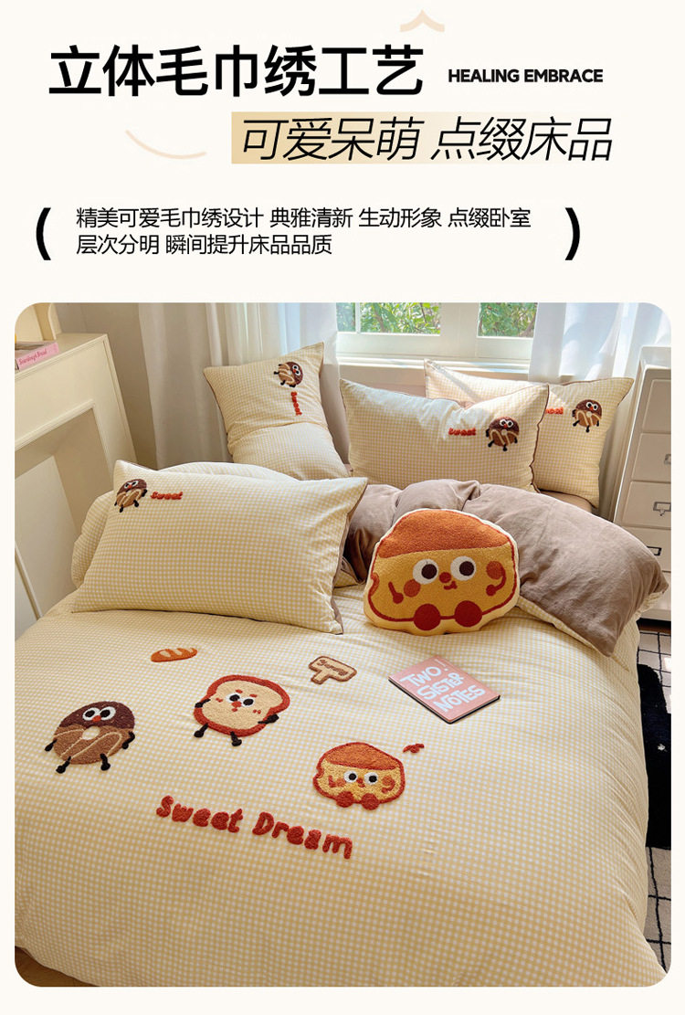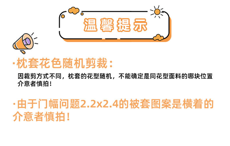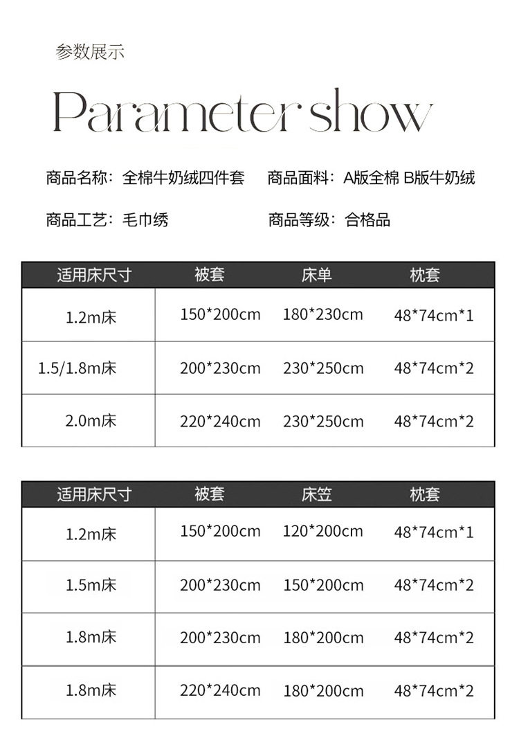 | Size specifications | 1.2m bed sheet three-piece set [suitable for 150x200cm quilt],1.5m bed sheet four-piece set [suitable for 200x230cm quilt],1.8m bed sheet four-piece set [suitable for 200x230cm quilt],2.0m bed sheet four-piece set [suitable for 220x240cm quilt],1.2m [three-piece fitted sheet set] suitable for 150x200cm quilt,1.5m [four-piece fitted sheet set] suitable for 200x230cm quilt,1.8m [four-piece fitted sheet set] suitable for 200x230cm quilt,1.8m quilt cover and extra fitted sheet set of four [suitable for 220x240cm quilt] |