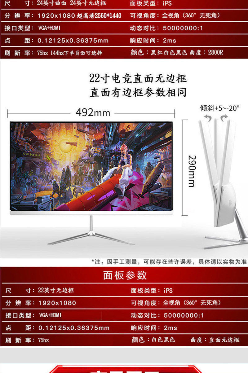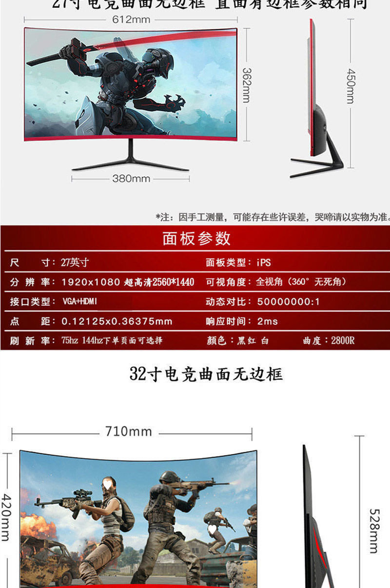 | Size | E-sports curved white level-joint model 24-inch 1k100hz event promotion,E-sports curved white level-co-branded model 25-inch 1k75hz borderless【3】,E-sports curved white level-co-branded model 25-inch 1k100hz borderless【3】,E-sports curved white level-co-branded model 24-inch 1k144hz borderless【3】,E-sports curved white level-co-branded model 24-inch 1k165hz borderless【3】,E-sports curved white level-co-branded model 24-inch 1k180hz borderless【3】,E-sports curved white level-co-branded model 24-inch 1k200hz borderless【3】,E-sports curved white level - joint model 24 inches 1k240hz borderless [3],E-sports curved white level-co-branded model 24-inch 1k300hz borderless【3】,E-sports curved white level-co-branded model 24-inch 2k144hz borderless【3】,E-sports curved white level-co-branded model 24-inch 2k165hz borderless【3】,E-sports curved white level-co-branded model 24-inch 2k180hz borderless【3】,E-sports curved white level-co-branded model 24-inch 2k144hz dual configuration borderless【3】,E-sports curved white level-co-branded model 27-inch 1k75hz borderless【3】,E-sports curved white level-co-branded model 27-inch 1k100hz borderless【3】,E-sports curved white level-co-branded model 27-inch 1k144hz borderless【3】,E-sports curved white level-co-branded model 27-inch 1k165hz borderless【3】,E-sports curved white level-co-branded model 27-inch 1k180hz borderless【3】,E-sports curved white level-joint model 27-inch 1k200hz frameless [3],E-sports curved white level-co-branded model 27-inch 1k240hz borderless【3】,E-sports curved white level-co-branded model 27-inch 1k280hz borderless【3】,E-sports curved white level - joint model 27-inch 2k100hz borderless [3],E-sports curved white level-co-branded model 27-inch 2k144hz borderless【3】,E-sports curved white level-co-branded model 27-inch 2k165hz borderless【3】,E-sports curved white level - joint model 27-inch 2k180hz borderless [3],E-sports curved white level-co-branded model 27-inch 2k144hz dual configuration borderless【3】,E-sports curved white level-co-branded model 27-inch 2k240hz borderless【3】,E-sports curved white level - joint model 32 inches 1k144hz borderless [3],E-sports curved white level-co-branded model 32-inch 1k165hz borderless【3】,E-sports curved white level-joint model 32inch borderless 1k180hz borderless【3】,E-sports curved white level-co-branded model 32-inch 1k200hz frameless [3],E-sports curved white level-co-branded model 32-inch 1k240hz borderless【3】,E-sports curved white level-co-branded model 32-inch 1k280hz borderless【3】,E-sports curved white level-joint model 32inch borderless 2k144hz borderless【3】,E-sports curved white level-joint model 32inch borderless 2k165hz borderless【3】,E-sports curved white level-joint model 32inch borderless 2k180hz borderless【3】,E-sports curved white level - joint model 32-inch 2k144hz dual configuration borderless [3],E-sports curved white level-co-branded model 32-inch 4k144hz dual configuration [3],E-sports curved black level (black and red can be noted) - joint model 24-inch 1k100hz event promotion,E-sports curved black level (black and red can be noted) - joint model 25-inch 1k75hz borderless [3],E-sports curved black level (black and red can be noted) - joint model 25-inch 1k100hz borderless [3],E-sports curved black level (black and red can be noted) - joint model 24-inch 1k75hz event promotion,E-sports curved black level (black and red can be noted) - joint model 24-inch 1k144hz borderless [3],E-sports curved black level (black and red can be noted) - joint model 24-inch 1k165hz borderless [3],E-sports curved black level (black and red can be noted) - joint model 24-inch 1k180hz borderless [3],E-sports curved black level (black and red can be noted) - joint model 24-inch 1k200hz borderless [3],E-sports curved black level (black and red can be noted) - joint model 24-inch 1k240hz borderless [3],E-sports curved black level (black and red can be noted) - joint model 24-inch 1k300hz borderless [3],E-sports curved black level (black and red can be noted) - joint model 24-inch 2k144hz borderless [3],E-sports curved black level (black and red can be noted) - joint model 24-inch 2k165hz borderless [3],E-sports curved black level (black and red can be noted) - joint model 24-inch 2k180hz borderless [3],E-sports curved black level (black and red can be noted) - joint model 24-inch 2k144hz dual configuration borderless [3],E-sports curved black level (black and red can be noted) - joint model 27-inch 1k75hz borderless [3],E-sports curved black level (black and red can be noted) - joint model 27 inches 1k100hz borderless [3],E-sports curved black level (black and red can be noted) - joint model 27-inch 1k144hz borderless [3],E-sports curved black level (black and red can be noted) - joint model 27 inches 1k165hz borderless [3],E-sports curved black level (black and red can be noted) - joint model 27 inches 1k180hz borderless [3],E-sports curved black level (black and red can be noted) - joint model 27 inches 1k200hz frameless [3],E-sports curved black level (black and red can be noted) - joint model 27-inch 1k240hz borderless [3],E-sports curved black level (black and red can be noted) - joint model 27 inches 1k280hz borderless [3],E-sports curved black level (black and red can be noted) - joint model 27-inch 2k100hz borderless [3],E-sports curved black level (black and red can be noted) - joint model 27-inch 2k144hz borderless [3],E-sports curved black level (black and red can be noted) - joint model 27-inch 2k165hz borderless [3],E-sports curved black level (black and red can be noted) - joint model 27-inch 2k180hz borderless [3],E-sports curved black level (black and red can be noted) - joint model 27-inch 2k144hz dual configuration borderless [3],E-sports curved black level (black and red can be noted) - joint model 27-inch 2k240hz borderless [3],E-sports curved black level (black and red can be not