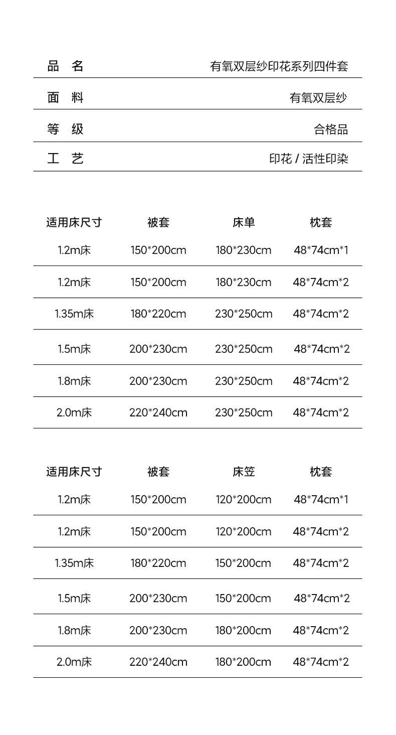 | Size specifications | 1.2m three-piece bed sheet set [quilt cover 150x200],1.2m bed sheet four-piece set [quilt cover 150x200],1.5m bed sheet four-piece set [quilt cover 150x200],1.5m bed sheet four-piece quilt cover [180x220],1.8m bed sheet four-piece quilt cover [180x220],1.5m bed sheet four-piece set [quilt cover 200x230],1.8m bed sheet four-piece set [quilt cover 200x230],2.0m bed sheet four-piece set [quilt cover 220x240],1.2m three-piece fitted sheet set [quilt cover 150x200],1.5m fitted sheet set of four [quilt cover 180x220],1.8m fitted sheet set of four [quilt cover 180x220],1.5m fitted sheet set of four [quilt cover 200x230],1.8m fitted sheet set of four [quilt cover 200x230],1.8m fitted sheet set of four [quilt cover 220x240],150x200cm single quilt cover,180x220cm single quilt cover,200x230cm single quilt cover,220x240cm single quilt cover |