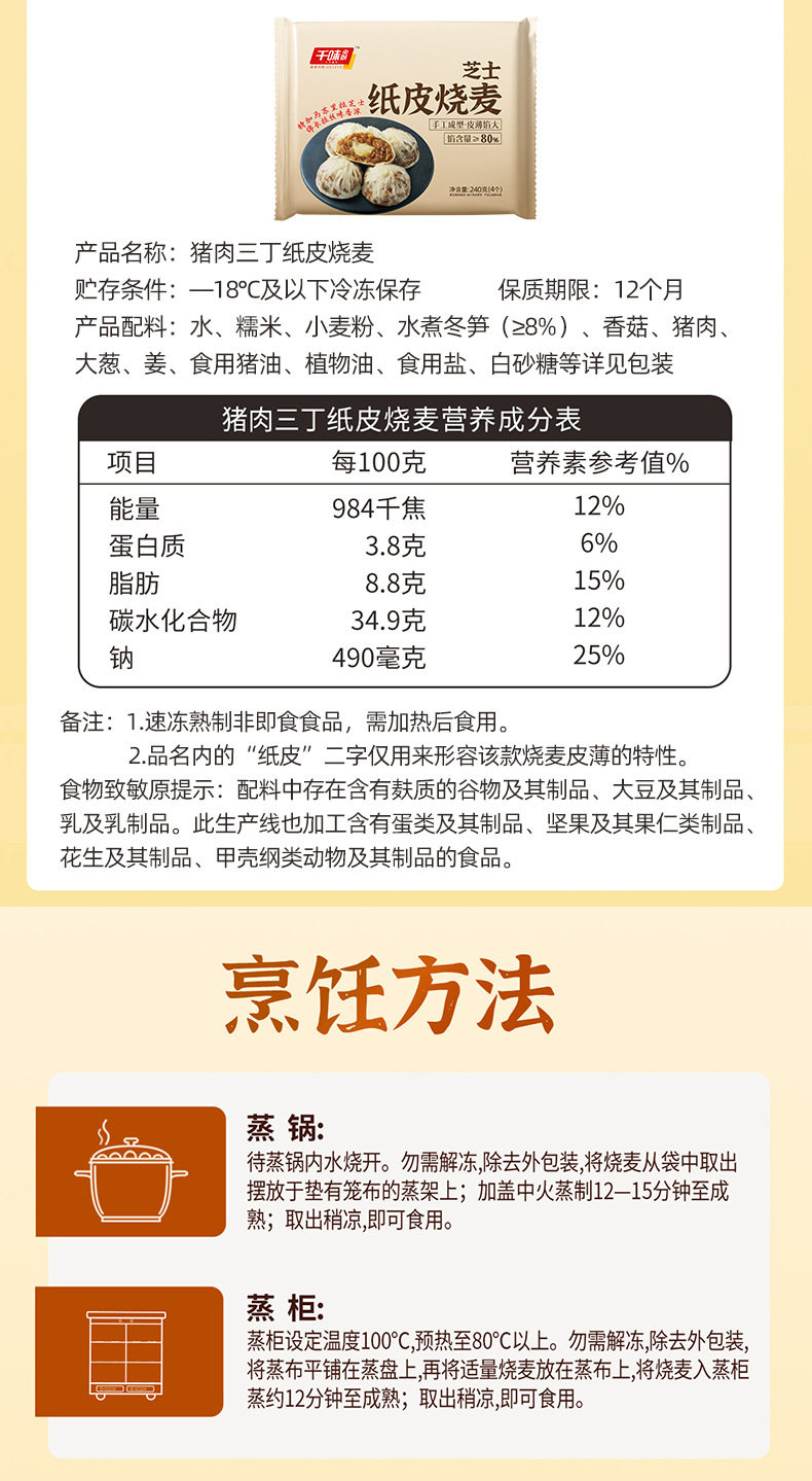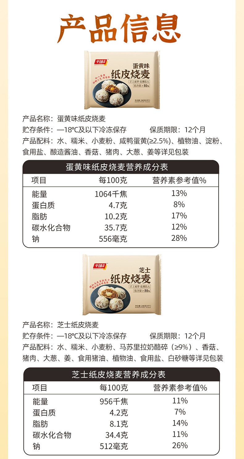 | Packaging specifications | Zto/yto free shipping qianwei 240g pork three-ding paper-skinned siomai*1 bag,Zto/yto free shipping qianwei 240g pork three-ding paper-skinned shaomai*2 bags,Zto/yto free shipping qianwei 240g pork three-ding paper-skinned shaomai*3 bags,Zto/yto free shipping qianwei 240g pork three-ding paper-skinned shaomai*4 bags,Zto/yto free shipping qianwei 240g pork three-ding paper-skinned shaomai*5 bags,Zto/yto free shipping qianwei 240g pork three-ding paper-skinned shaomai*6 bags,Zto/yto free shipping qianwei 240g pork three-ding paper-skinned shaomai*7 bags,Zto/yto free shipping qianwei 240g pork three-ding paper-skinned siomai*8 bags,Zto/yto free shipping qianwei 240g egg yolk flavor paper-skinned shaomai*1 bag,Zto/yto free shipping qianwei 240g egg yolk flavor paper-skinned shaomai*2 bags,Zto/yto free shipping qianwei 240g egg yolk flavor paper-skinned siomai*3 bags,Zto/yto free shipping qianwei 240g egg yolk flavor paper-skinned shaomai*4 bags,Zto/yto free shipping qianwei 240g egg yolk flavor paper-skinned siomai*5 bags,Zto/yto free shipping qianwei 240g egg yolk flavor paper-skinned shaomai*6 bags,Zto/yto free shipping qianwei 240g egg yolk flavor paper-skinned siomai*7 bags,Zto/yto free shipping qianwei 240g egg yolk flavor paper-skinned shaomai*8 bags,Zto/yto free shipping qianwei 240g egg yolk flavor paper-skinned siomai*1 bag + qianwei 240g pork three-ding paper-skinned siomai*1 bag,Zto/yto free shipping qianwei 240g egg yolk flavor paper-skinned siomai*2 bags + qianwei 240g pork three-ding paper-skinned siomai*2 bags,Zto/yto free shipping qianwei 240g egg yolk flavor paper-skinned siomai*3 bags + qianwei 240g pork three-ding paper-skinned siomai*3 bags,Zto/yto free shipping qianwei 240g egg yolk flavor paper-skinned siomai*4 bags + qianwei 240g pork three-ding paper-skinned siomai*4 bags,Zto/yto free shipping qianwei 240g cheese paper-skinned siomai*1 bag,Zto/yto free shipping qianwei 240g cheese paper-skinned siomai*2 bags,Zto/yto free shipping qianwei 240g cheese paper-skinned siomai*3 bags,Zto/yto free shipping qianwei 240g cheese paper-skinned siomai*4 bags,Zto/yto free shipping qianwei 240g cheese paper-skinned siomai*5 bags,Zto/yto free shipping qianwei 240g cheese paper-skinned siomai*6 bags,Zto/yto free shipping qianwei 240g cheese paper-skinned siomai*7 bags,Zto/yto free shipping qianwei 240g cheese paper-skinned siomai*8 bags,Yuantong free shipping 240g egg yolk flavored paper-skinned siomai*1 bag + 240g pork three-ding paper-skinned siomai*1 bag + 240g cheese paper-skinned siomai*1 bag,Yuantong free shipping 240g egg yolk flavored paper-skinned siomai*2 bags+240g pork three-ding paper-skinned siomai*2 bags+240g cheese paper-skinned siomai*2 bags,Free shipping for zto/yto 240g egg yolk flavored paper-skinned siomai*2 bags + 240g cheese paper-skinned siomai*2 bags,Yuantong free shipping 240g egg yolk flavored paper-skinned siomai*1 bag+240g pork three-ding paper-skinned siomai*1 bag+240g cheese paper-skinned siomai*2 bags,Zto/yto free shipping qianwei 240g cheese paper-skinned siomai 1 bag + qianwei 240g egg yolk flavored paper-skinned siomai 1 bag |