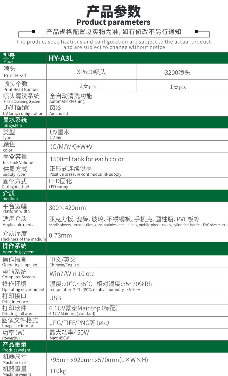 | Specifications | A3uv flatbed double-head xp600 nozzle,A3uv flatbed machine 3200 single head |