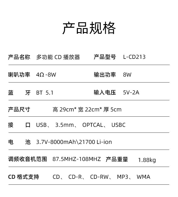 | Package list | Cd player*1 charging cable*1 manual*1 remote control*1 |