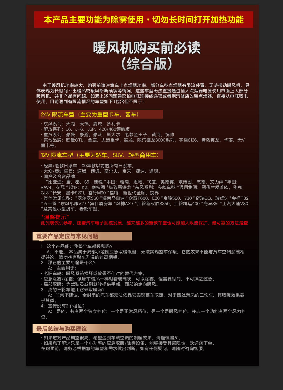 Color Black 12v,White 12v,Black 24v,White 24v,Classic heater black 12v,Classic heater black 24v,New handheld heater black 12v,New handheld heater white 12v,Purification handheld heater black 12v,Purification handheld heater white 12v,Warm air double bracket heater 12v,Purification double bracket heater 12v,G type heater black 12v,G type heater red 12v,G type heater yellow 12v,F type heater yellow black 12v,F type heater blue black 12v,L type heater black 12v,L type heater red 12v,L type heater yellow 12v,L type heater black 24v,L type heater red 24v,L type heater yellow 24v,Three-hole heater black 12v,Three-hole heater red 12v,Round heater black 12v,Round heater black 24v,Round heater brown 12v,Round heater brown 24v,Square heater black 12v,Square heater black 24v,Square heater brown 12v,Square heater brown 24v