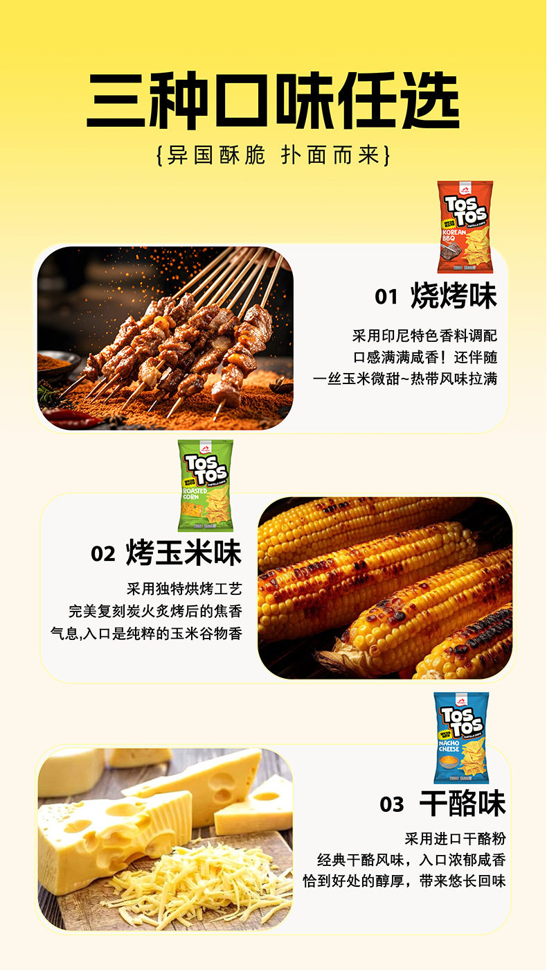 | Packaging specifications | Bbq 145g,Cheese flavor 145g,Grilled corn flavor 145g |
