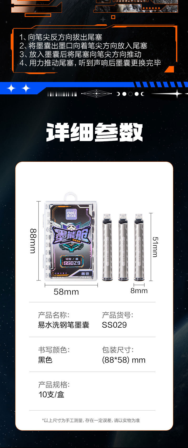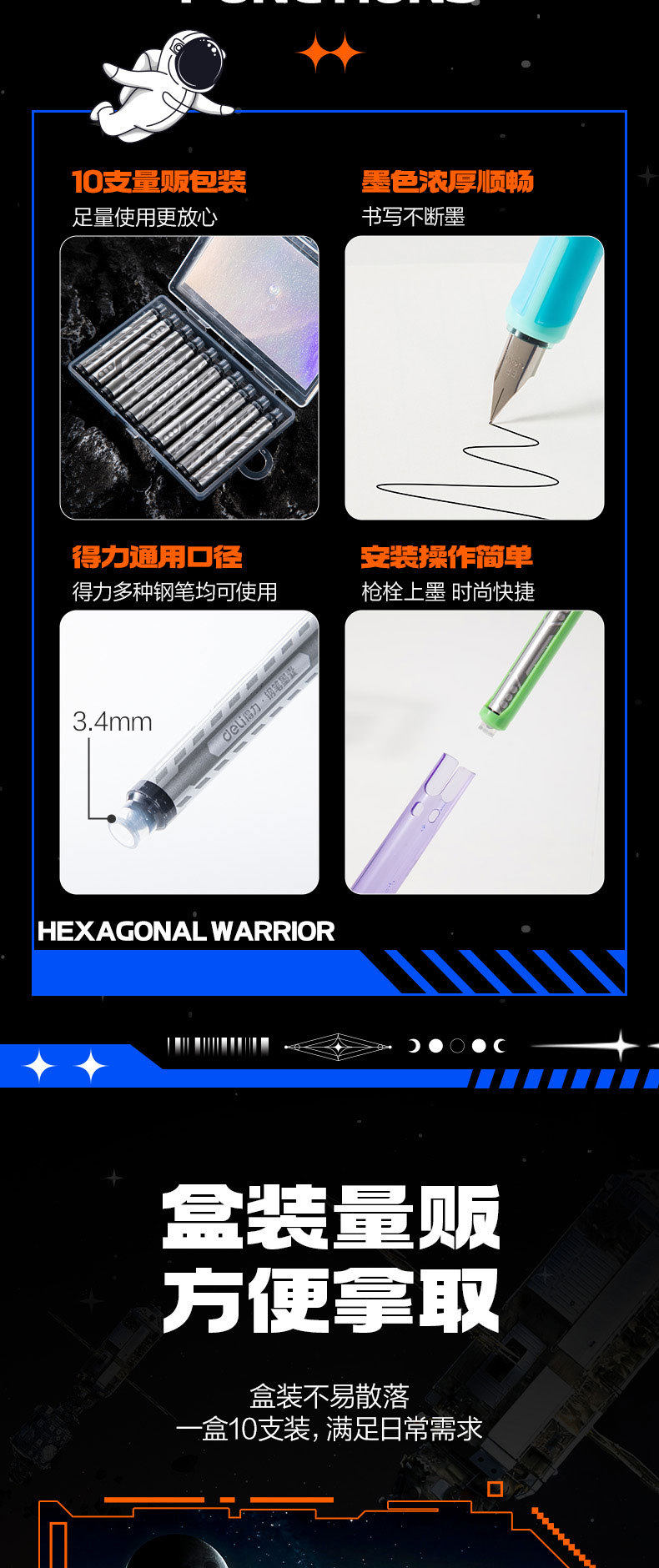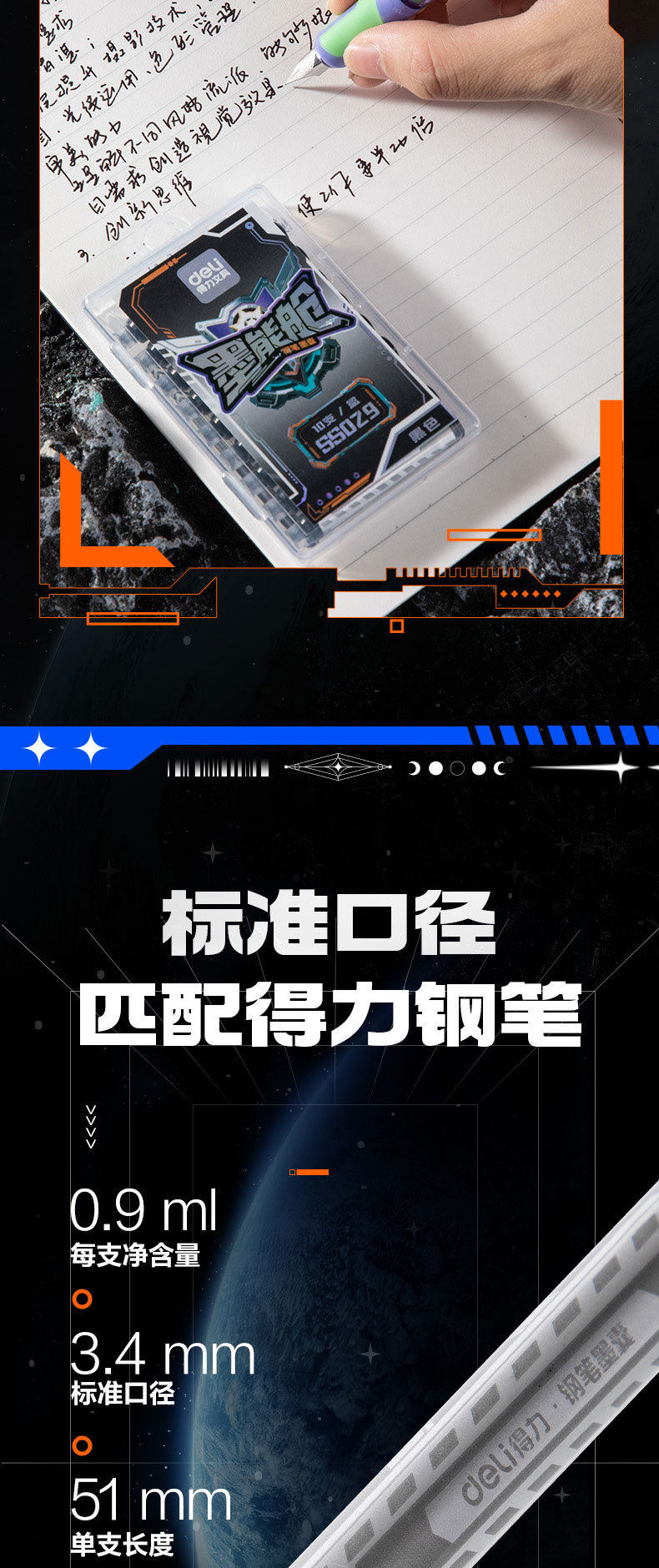 Deli Ss029 Ink Cartridge Easy-To-Clean Student Fountain Pen Ink Cartridge 3.4mm Children's Handwriting Practice Crystal Blue Ink Blue Black Ink